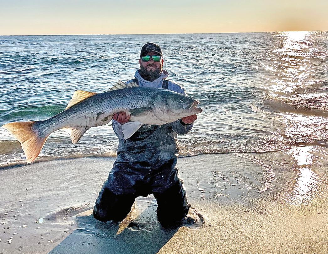 At the same time, big schools of striped bass will be marauding bait sh on the beaches and in the inlets. Surf anglers can encounter them blitzing menhaden by looking for bait and birds. Charter boats do good business this time of year trolling while keeping eyes peeled for stripers herding and crashing bait balls.