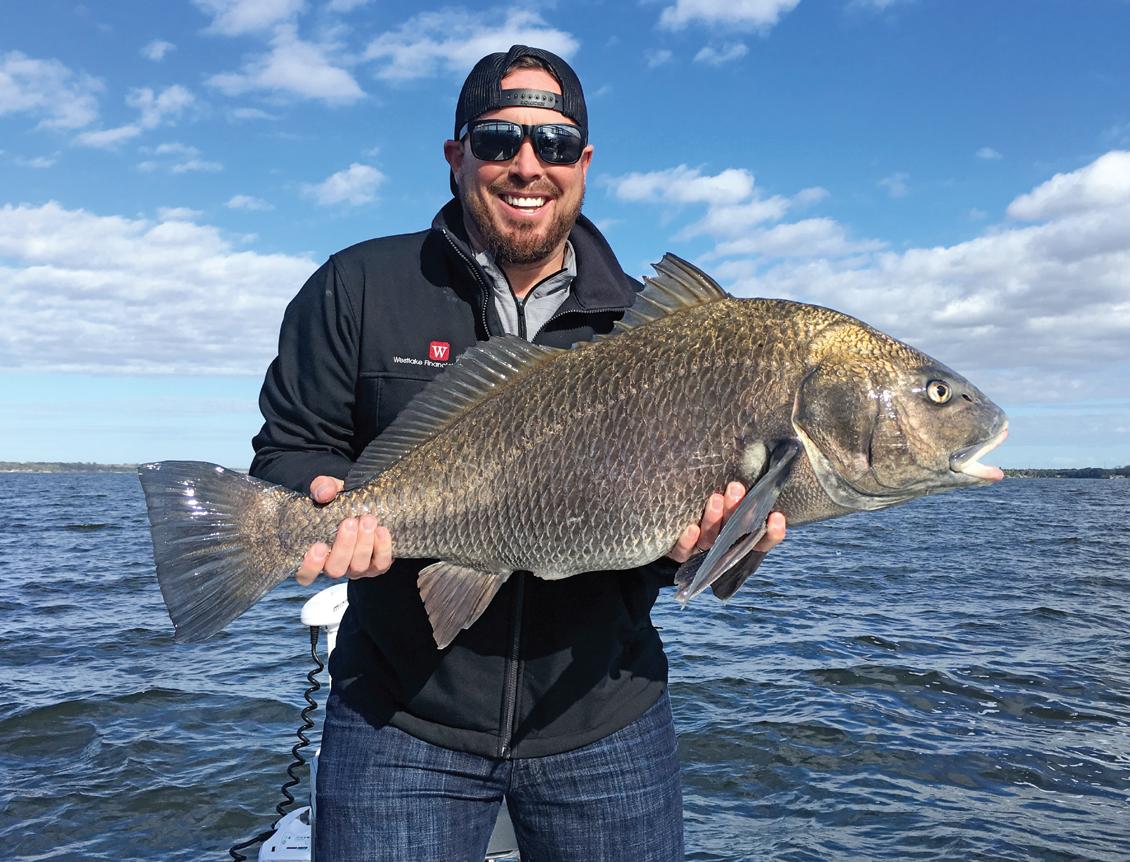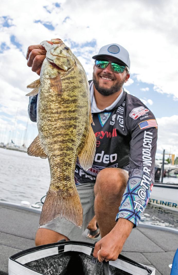 “With an abundance of bait sh and unique bottom composition located a er long days behind the graphs, we dropped down our forward-facing sonar and we were able to individually target these pelagicesque smallmouth,” he told In-Fisherman. “On what turned out to be the most memorable cast of my life, my bait got hit before it even hit the bottom and my rod quickly doubled over. I honestly thought I had hooked into a sheephead and not a smallmouth. We quickly learned we had just caught the smallmouth of a lifetime.”