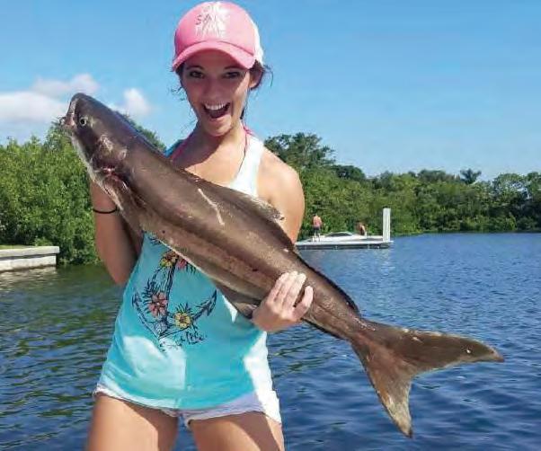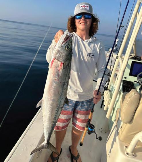 Te tactics are the same and simple. Tey will eat dead or live bait in most cases. Tat said, I found a combination of the two to be the best bet. I like to start with “stinky bait.” Dropping some frozen squid or menhaden is a great way to get the bite going. Once the bite starts, which is usually quickly if they are around, I like to switch to palm-size live pinfsh to entice the bigger fsh. While dead bait and jigs will certainly get you keepers, the larger fsh are quicker to hit a live bait.
