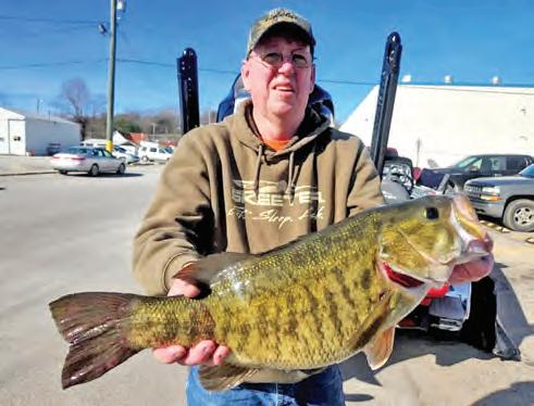 In Indiana, angler Rex Remington caught his big pre-spawn smallie on March 3 at Monroe Reservoir. Te fsh was weighed on certifed scales in the presence of Indiana DNR ofcials before being released. Te new record was adopted a couple weeks later and is listed at 8 pounds, 4 ounces, beating a record that had stood since 1992. Te all-tackle world record smallmouth weighed 11 pounds, 15 ounces. It was caught from Dale Hollow Lake, Tennessee in 1955.