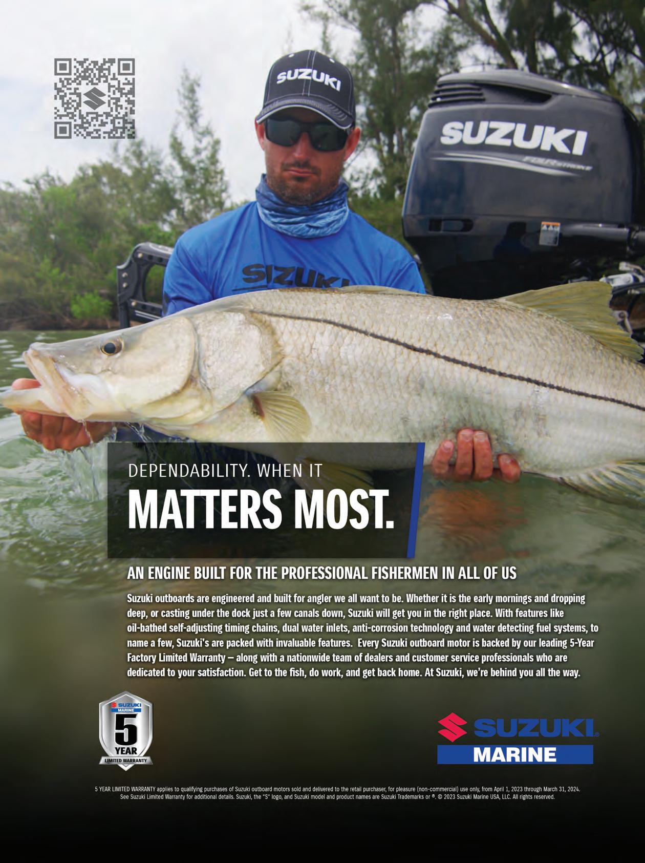 Coastal Angler and The Angler Magazine, Suzuki Marine and Sea Eagle have come together to offer readers a shot at this Sea Eagle FishSkiff 16 paired with a Suzuki DF4 outboard that’ll take you wherever the fish are. The FishSkiff 16 is an inflatable fishing boat that is lightweight, sturdy, stable and extremely packable. It rolls up small enough to fit in the trunk of a car and quickly inflates into a fishing machine. Powered by Suzuki’s four-stroke DF4A, you’ll have to hold on to your hat as you scream over the flats. Designed for efficiency and performance and portability, the DF4A provides all the speed and acceleration you can handle. It’s lightweight and can be attached or removed with ease.