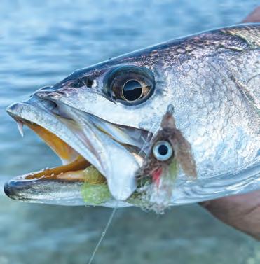TECHNIQUE: Identify the feeders. Bluefsh, jacks, mackerel, ladyfsh, kingfsh and barracuda are all aggressive feeders that like fashy lures and fast retrieves. If you’re fshing for tarpon, a slow steady retrieve is better. Snook will hit a slow retrieve and can also be caught in shallower water by jigging of the bottom around the frst cut. Whiting, pompano and croakers are all easily caught twitching a lure of the bottom, but you must get it out to them.