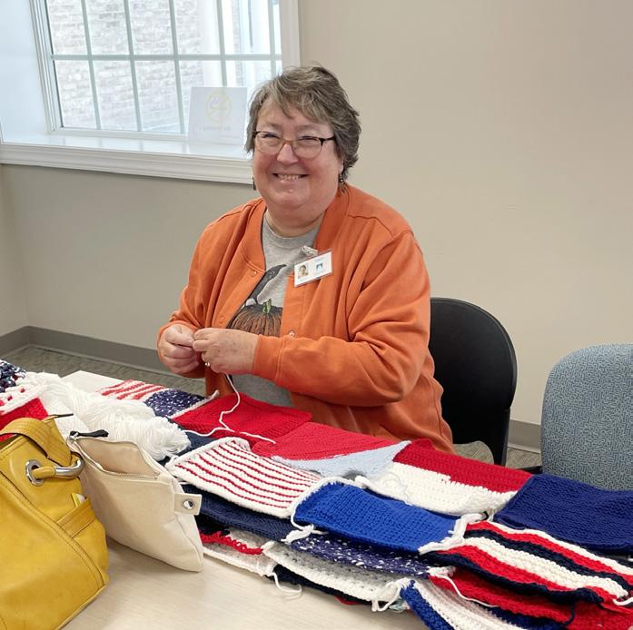 In 2017, the then Coastal Hospice Volunteer Coordinator and Maggie began the Coastal Hospice Knitting/Crochet Group, which still stands today, producing quilts for each one of our Coastal Hospice patients and red, white, and blue quilts for our We Honor Veteran patients. In addition to quilts, they produce twiddle muffs (sensory tool for patients with Dementia). Maggie encourages the community to join or donate to the group. In addition, Maggie is in a group called, Fiber Friends, which meets every Friday 10 to 12 at the Ocean Pines Library. Many in this group make squares that they donate to our Coastal Hospice Knitting/Crochet Group, which helps to complete additional We Honor Veteran’s blankets.