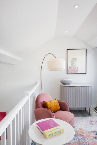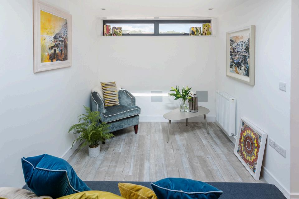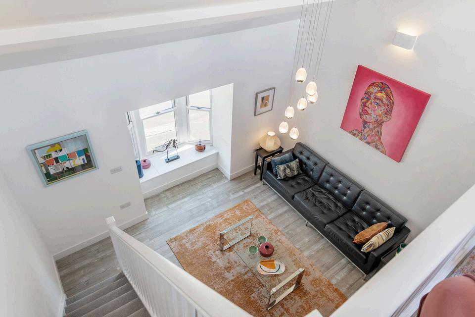 Glide up the staircase now to the first floor - a quirky and delightful greeting to the Open-Plan Living Space greets us - but wait - a projection screen descends electronically covering the clerestory window, plunging this space into darkness and creating a Cinema Room - a great use of space to curl up and watch a film