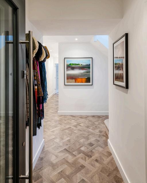 A skylight providing natural light through the centre of the home draws us into the attractive Entrance Hall via an over-sized glazed door Handy under-stair cupboards offer storage, a media system and a great Utility Room
