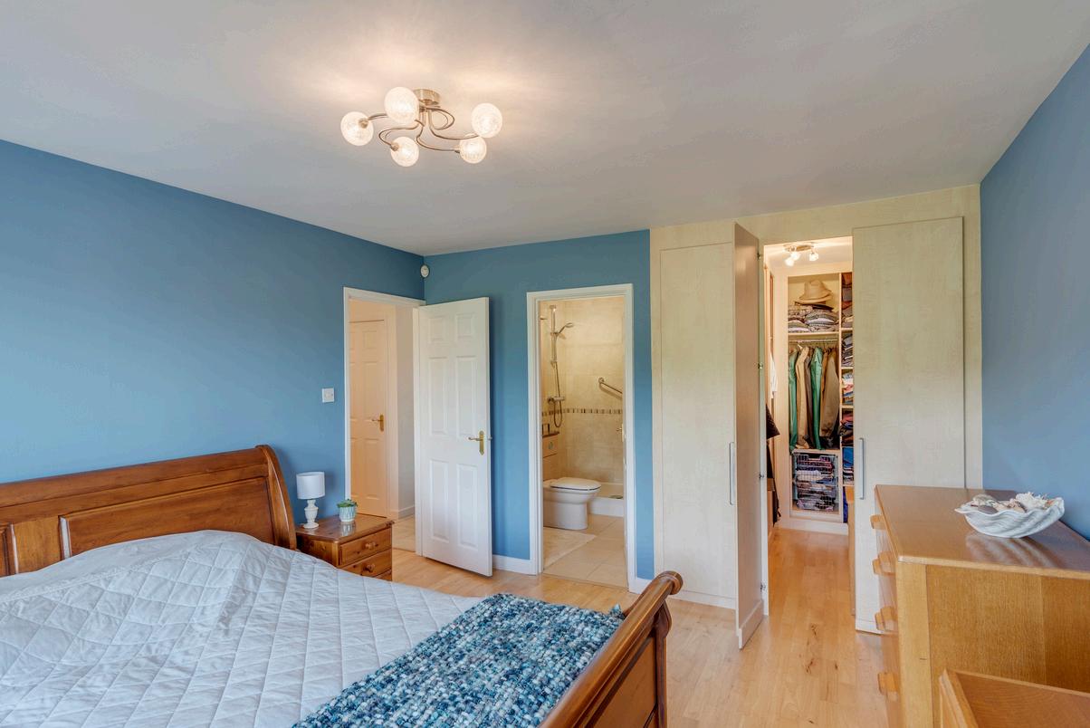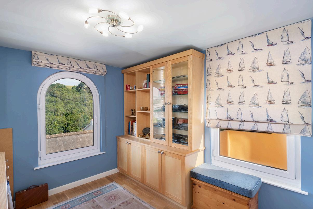 On the ground floor, the Principal Bedroom is a calm sanctuary, featuring a modern En-suite Shower Room, a surprise walk-in wardrobe, and the charm of a unique arched windows framing water views