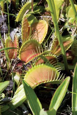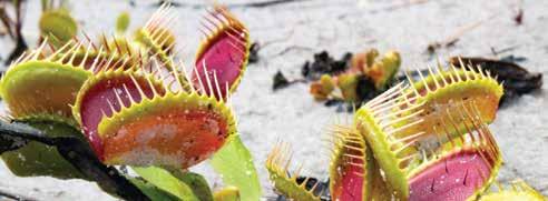 flytrap is a meat-eating killer – think ‘Little Shop of Horrors’. At the end of each leaf is a pair of terminal lobes that, when triggered, snap shut trapping prey. As the insect struggles, the trap tightens, and the flytrap secretes enzymes, turning the prey to liquid for easy digestion. Also carnivorous, pitcher plants and sundews are often neighbors, along with many varieties of moss.