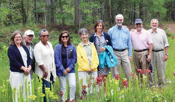 Board members are dazzled by the sea of pitcher plants in the Stanley Rehder Carnivorous Plant Garden. From left: Board President Ann Simpson, John Fussell, Lovay Wallace-Singleton, Merrie Jo Alcoke, Sadie Price, Hannah Holt, Paul Hosier, Coastal Land Trust Ambassador Royster Hedgepeth, and Robert Perry.