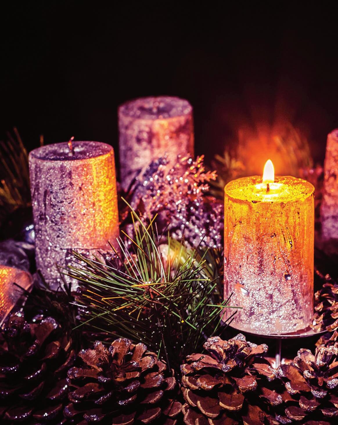 TheoriginsofAdvent,however, reflectadifferenttypeofanticipation,onethatismorespiritual. Thewell-knownsymbolofthe fourweeksbeforeChristmas,the Adventwreath,isgene rally adornedwithfourcandles.Traditionally,thecandlesincludefour pinkandonepurple,butsome churchesuseblueandwhitecandlesinstead.