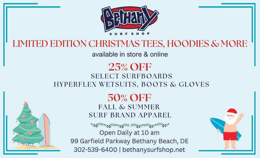 Youdon’thavetobeasurfertoloveBethanySurfShop.Fromkidsto adults,youcanfindawesomesweatshirts,sweatpants,andT-shirts,allcustom-designedwiththeirlogosandartwork—greatforanyoneonyourlist. Whilethere,don’tforgettogetyourselfsomeholidayattirewiththeirlimited-editionChristmasteesandhoodies.Andforthesurfer,everythingthey mightneedisavailable,includingboards,wetsuits,andsomuchmore.