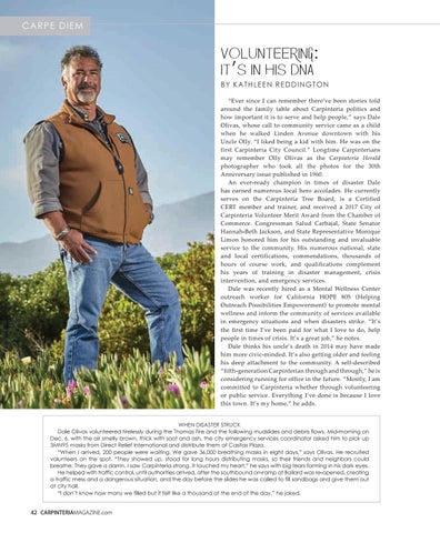 Volunteering: It’s in his DNA By K a t h l e e n r eDDi n gt on “Ever since I can remember there’ve been stories told around the family table about Carpinteria politics and how important it is to serve and help people,” says Dale Olivas, whose call to community service came as a child when he walked Linden Avenue downtown with his Uncle Olly. “I liked being a kid with him. He was on the first Carpinteria City Council.” Longtime Carpinterians may remember Olly Olivas as the Carpinteria Herald photographer who took all the photos for the 30th Anniversary issue published in 1960. An ever-ready champion in times of disaster Dale has earned numerous local hero accolades. He currently serves on the Carpinteria Tree Board, is a Certified CERT member and trainer, and received a 2017 City of Carpinteria Volunteer Merit Award from the Chamber of Commerce. Congressman Salud Carbajal, State Senator Hannah-Beth Jackson, and State Representative Monique Limon honored him for his outstanding and invaluable service to the community. His numerous national, state and local certifications, commendations, thousands of hours of course work, and qualifications complement his years of training in disaster management, crisis intervention, and emergency services. Dale was recently hired as a Mental Wellness Center outreach worker for California HOPE 805 (Helping Outreach Possibilities Empowerment) to promote mental wellness and inform the community of services available in emergency situations and when disasters strike. “It’s the first time I’ve been paid for what I love to do, help people in times of crisis. It’s a great job,” he notes. Dale thinks his uncle’s death in 2014 may have made him more civic-minded. It’s also getting older and feeling his deep attachment to the community. A self-described “fifth-generation Carpinterian through and through,” he is considering running for office in the future. “Mostly, I am committed to Carpinteria whether through volunteering or public service. Everything I’ve done is because I love this town. It’s my home,” he adds. When Disaster struCK Dale olivas volunteered tirelessly during the thomas Fire and the following mudslides and debris flows. mid-morning on Dec. 6, with the air smelly brown, thick with soot and ash, the city emergency services coordinator asked him to pick up 3mn95 masks from Direct relief international and distribute them at Casitas plaza. “When i arrived, 200 people were waiting. We gave 36,000 breathing masks in eight days,” says olivas. he recruited volunteers on the spot. “they showed up, stood for long hours distributing masks, so their friends and neighbors could breathe. they gave a damn. i saw Carpinteria strong. it touched my heart,” he says with big tears forming in his dark eyes. he helped with traffic control, until authorities arrived, after the southbound on-ramp at Bailard was re-opened, creating a traffic mess and a dangerous situation, and the day before the slides he was called to fill sandbags and give them out at city hall. “i don’t know how many we filled but it felt like a thousand at the end of the day,” he joked. 42 CARPINTERIAMAGAZINE.com