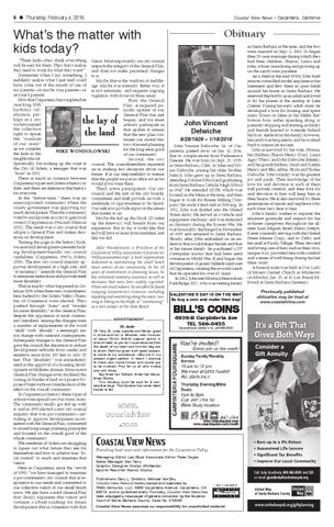 in Santa Barbara at the time, and the two were married on Sept. 8, 1962. So began their 53-year marriage during which they “These kids—they think everything vision. Most importantly, our city council had their children, Sharon, Laura and will be easy for them. They don’t realize respects the integrity of the General Plan, John, whose years living and growing up they need to work for what they want!” and does not make piecemeal changes on the ranch were priceless. IS, ND, EIR, DEIR, CEQA: what do decisions that are in the community’s Sometimes when I say something, I it. As a child in the mid 1930s, John built they mean? How about CDD, ERO, CEG, best to interest. suddenly realize what I just said could Maybe that is the middleremote-controlled model airplanes in his ERC? Maybe it will help to see them all So California cities andwisdom countiesofsolve have come out of the mouth of one of age. Maybe it is maturity. Either way, it basement and flew them in open fields used in a sentence: this problem through a process that my parents—or maybe your parents—or is not automatic, and requires ongoing around his home in Santa Barbara. He At the ERC meeting, the ERO (who works strives to develop one set of facts that anyone’s parents. vigilance, with focus on three areas: renewed this hobby as an adult and loved in the CDD) explained that under CEQA and decision-makers can use to evaluate Now that Carpinteria has completed its First, the General to fly his planes at the airstrip at Lake the CEG, the IS makes project proposals year-long 50th Plan: A everyone required peCasitas. During his early adult years, he it clear that an ND (because birthday celupdate of our developed a love for boating and spent would not be sufficient, isriodic not entitled to his ebration, perGeneral Plan has just many hours on lakes in his Miller flatand the project would own facts!). haps as a city begun, and we must bottom boat, either speeding along or require an EIR, so a For a project prowe have earned actively participate in patiently stopping and starting as family DEIR will be prepared. posal, the results the collective that update to ensure and friends learned to waterski behind That explains evof an Initial Study right to speak that the new plan conhis boat. Aside from his family, however, erything, right? (IS) determine what the “wisdom tinues recent his9/29/1929 – 1/18/2016 his ranch was his passion, and he worked You are probably type of our fact-filled of our years” tory of sound planning John Vincent Delwiche, 86, of Car- hard to ensure its success. wondering what all document will be as we consider for the long-term John is survived by his wife, Norma, this is and if it even prepared. A smallgood pinteria, passed away on Jan. 18, 2016, MIKE WONDOLOWSKI the kids in the of our community. his children, Sharon Henry (Dan), Laura due to complications from Parkinson’s matters. Well, this alproject might reneighborhood. Second, the city Agey (Theo), and John Delwiche (Mieke), Disease. He was born on Sept. 29, 1929, phabet soup is at the quire only the miniSpecifically, I’m looking up the coast at council: The councilmembers represent in Santa Barbara, Calif., to Jules and Viv- and his grandchildren, Sarah and Kaitlin core of our local planning and develop- mal analysis of a Negative Declaration the City of Goleta, a teenager that was us in making key decisions about our ian Delwiche, joining his older brother, Henry, and Ella, Abbie, Skyla and Tucker ment process. It really does matter, a lot! (ND) (more on that in next month’s “born” in 2002. future. It is our responsibility to ensure Jules Jr. John grew up in Santa Barbara, Delwiche. John’s family was his greatest Any proposed development project in column). There is much in common between that the people we put in office act as we attending Dolores School and graduating joy and pride. Their knowledge of his California must go through a process of For larger projects, the document that Carpinteria’s past and Goleta’s history to would if we were there. from Santa Barbara Catholic High School love for and devotion to each of them objective study and analysis. This process contains the facts is the Environmental date, and there are lessons in this history Third, active participation: Our city in 1947. He attended UCSB, which was will provide comfort, and their love for is defined by the California Environmen- Impact Report (EIR). What’s especially for everyone. council and the rest of the city boards, located on the Mesa at the time, and then and devotion to him will keep him in tal Quality Act (CEQA). In the City of cool about the environmental review In the “before-time,” there was an committees and staff provide us with a began to work for Roeser Milling Com- their hearts. He is also survived by three Carpinteria, the way CEQA is applied process that generates the EIR is that it is a unincorporated community where the multitude of opportunities to be heard. pany, his uncle’s feed mill in Solvang. In generations of nieces and nephews who SUBMITTED PHOTO is described in the City Environmental completely open process where the public county government was approving too Our task is to provide input on the issues 1952, eachSchool were very dear to Coley made history onhim. the JohnCandaele was drafted intoCarpinteria the United High Guidelines (CEG). is involved from the very beginning in the much development. Then the community that matter to us. John’s family wishes to States Army. as a In vehicle track and He theserved gridiron. 1990,and he became State Champion inexpress the Why such a strict process? Why can’t scoping of the analysis, through reviewvoted to incorporate as a city to gain local Maybe the kid up the block (20 miles sincerest gratitude and respect for his equipment mechanic was stationed the 1600M with a and national leading time of 4:06.26. our city council (or any city council) just ing the Draft