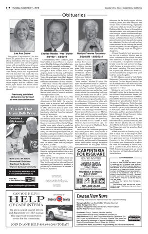 Providing local news and information for the Carpinteria Valley Managing Editor Lea Boyd Editor Christian Beamish Sales Manager Dan Terry Graphic Designers Kristyn Whittenton, Robin Karlsson Sports Reporter Alonzo Orozco Publishers Gary L. Dobbins, Michael VanStry Coastal View News is locally owned and operated by RMG Ventures, LLC, 4856 Carpinteria Avenue, Carpinteria, CA 93013, and is published every Thursday. Coastal View News has been adjudged a newspaper of general circulation by the Superior Court of Santa Barbara County, Case No. 210046.