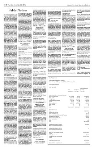 Coastal View News • Carpinteria, California date on which it was filed in the office of the County Clerk, except, as provided in subdivision (b) of section 17920, where it expires 40 days after any change in the facts set forth in the statement pursuant to section 17913 other than a change in the residence address of a registered owner. A new fictitious business name must be filed before the expiration. The filing of this statement does not of itself authorize the use in this state of a fictitious business name in violation of the rights of another under Federal, State, or common law (see section 1441 Et Seq., Business and Professions code). I hereby certify this copy is a correct copy of the original statement on file in my office. Joseph E. Holland, County Clerk (SEAL) by Noe Solis, deputy County Clerk, recorder and Assessor, No. 2015-0003227 Publish: Nov. 19, 26, dec. 3, 10, 2015. _________________________________ NOTICE OF PETITION TO ADMINISTER ESTATE CASE NUMBER 15PR00420 ESTATE OF JOSE O JIMENEz To all heirs, beneficiaries, creditors, contingent creditors, and persons who may otherwise be interested in the will or estate, or both, of JoSE o JimEnEz. A PETITION FOr PrOBATE has been filed by gEOrgE CASIllAS in the Superior Court of California, County of Santa Barbara. The PETITION FOr PrOBATE requests that gEOrgE CASIllAS be appointed as personal representative to administer the estate of the decedent. THE PETITION requests the decedent’s will and codicils, if any, be admitted to probate. The will and any codicils are available for examination in the file kept by the court. THE PETITION request authority to administer the estate under the Independent Administration of Estates Act. (This authority will allow the personal representative to take many actions without obtaining court approval. Before taking certain very important actions, however, the personal representative will be required to give notice to interested persons unless they have waived notice or consented to the proposed action.) The independent administration authority will be granted unless an interested person files an objection to the petition and shows good cause why the court should not grant the authority. A HEArINg on the petition will be held on december 24, 2015 at 9:00 a.m. in dept. 5 of the Superior Court of California, County of Santa Barbara, Anacapa division, at 1100 Anacapa Street, P.o. Box 21107, Santa Barbara, CA, 93121-1107. iF YoU oBJECT to the granting of a petition, you should appear at the hearing and state your objections or file written objections with the court before the hearing. your appearance may be in person or by your attorney. IF yOU ArE A CrEdITOr or a contingent creditor of the deceased, you must file your claim with the court and mail a copy to the personal representative appointed by the court within four months from the date of first issuance of letters as provided in Probate Code section 9100. The time for filing claims will not expire before four months from the heating date noticed above. YoU mAY EXAminE the file kept by the court. If you are a person interested in the estate, you may file with the court a request for Special Notice (form dE-154) of the filing of an inventory and appraisal of estate assets or of any petition or account as provided in Probate Code section 1250. A request for Special Notice form is available from the court clerk. Petitioner: gEOrgE CASIllAS 283 PlACEr dr., gOlETA, CA 93117 Telephone: 626-627-7903 Clerk, by denyse Avila, deputy, for Darrel E. Parker, Executive officer. Publish: Nov. 19, 26, dec. 3, 10, 2015. _________________________________ CITY OF CARPINTERIA SUMMAry OF PrOPOSEd OrdINANCE NO.704 As Introduced November 23, 2015, by the City of Carpinteria City Council AN OrdINANCE OF THE CITy COUNCIl OF THE CITy OF CArPINTErIA, CAlIFOrNIA, AMENdINg TITlE 6 (ANIMAlS) OF THE CArPINTErIA MUNICIPAl COdE TO rEQUIrE THAT All dOgS ANd CATS OVEr SIX MONTHS OF AgE lIVINg IN THE CITy BE SPAyEd Or NEUTErEd (WITH CErTAIN EXCEPTIONS) On November 23, 2015, the Carpinteria City Council introduced the above entitled Ordinance No. 704. In general the ordinance amends various sections of Title 6 - Animals, Chapter 6. 04 - Animal Control, of the Carpinteria Municipal Code, addressing animal care and control and adoption of a mandatory spay and neuter ordinance for all dogs and cats over six months of age living in the City of Carpinteria (with certain exceptions). A certified copy of the full text of ordinance no. 704 is posted in the office of the City Clerk, 5775 Carpinteria Avenue, Carpinteria, California, and is available for review upon request. The second reading and adoption of Ordinance No. 704 is currently scheduled for december 14, 2015 at 5:30 pm, at City Hall, 5775 Carpinteria Avenue, Carpinteria, California. Fidela garcia, CMC; City Clerk Publish: Nov. 26, 2015 _________________________________ CITY OF CARPINTERIA NOTICE OF PUBlIC HEArINg OF THE CITy OF CArPINTErIA PlANNINg COMMISSION