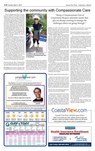 meaningful communication can proceed without direct face-to-face contact. What kind of feedback do you get from those you serve through your volunteer work? This is a win-win situation. I try to give support wherever it is needed at the moment it is needed. As a consequence, our clients are so appreciative and grateful that these relationships quickly become very deep and meaningful. Sweet is my word to describe my experience with Compassionate Care of Carpinteria clients; I think they feel the same. Can you share a specific experience that was particularly meaningful? I spent six weeks interviewing a hospice patient who wanted to record her life’s memories to give to her family. As her story unfolded, it became obvious that she had had many tragic moments that she had not faced but over these weeks of talking, she was now facing them head on. When I presented her with a record of her own words, she realized she didn’t want to hurt her family who might read them. A woman of great faith, she didn’t want to hurt anyone who might read about her difficult life. So together we deleted most of the words and pages we had just spent many hours documenting. From this I learned that the most important thing was the process of contemplating and facing what had happened and that the process is often more important than the outcome. Patient care volunteers have started transitioning back to in person care. Volunteers are visiting with patients when both the patient and the volunteer have provided their vaccination record. With proof of vaccination, they are visiting outside with masks on. They are also providing transportation to appointments/ treatments with masks on. As the county enters into less restrictive tiers, Compassionate Care of Carpinteria will continue to loosen these requirements. For information about receiving Compassionate Care of Carpinteria services or to volunteer, call (805) 679-6090
