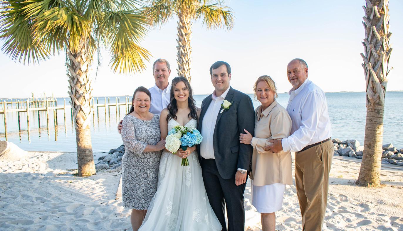 The stunning tablescape and florals were provided by Forget Me Knot and Emerald Coast Florals. Forget Me Knot set the stage with their natural wood table, champagne flutes, velvet bow napkins, and elegant flatware. Using our beautiful seaside as the inspiration, Emerald Coast Florals used native plants and flowers to complete this enchanting atmosphere.