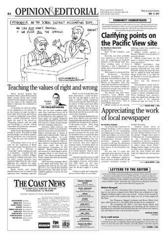 LETTERS TO THE EDITOR Letters to the Editor and reader feedback are welcome. Views expressed in letters do not necessarily reflect the views of The Coast News. Letters are subject to editing for length and clarity. Unsigned letters and letters without city of residence will not be published. Letters should be no longer than 300 words and include a contact telephone number. Submission does not guarantee publication. Send letters via e-mail to letters@coast newsgroup.com.