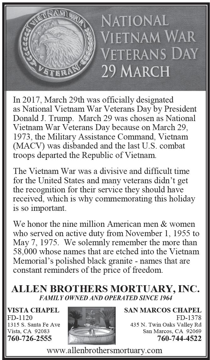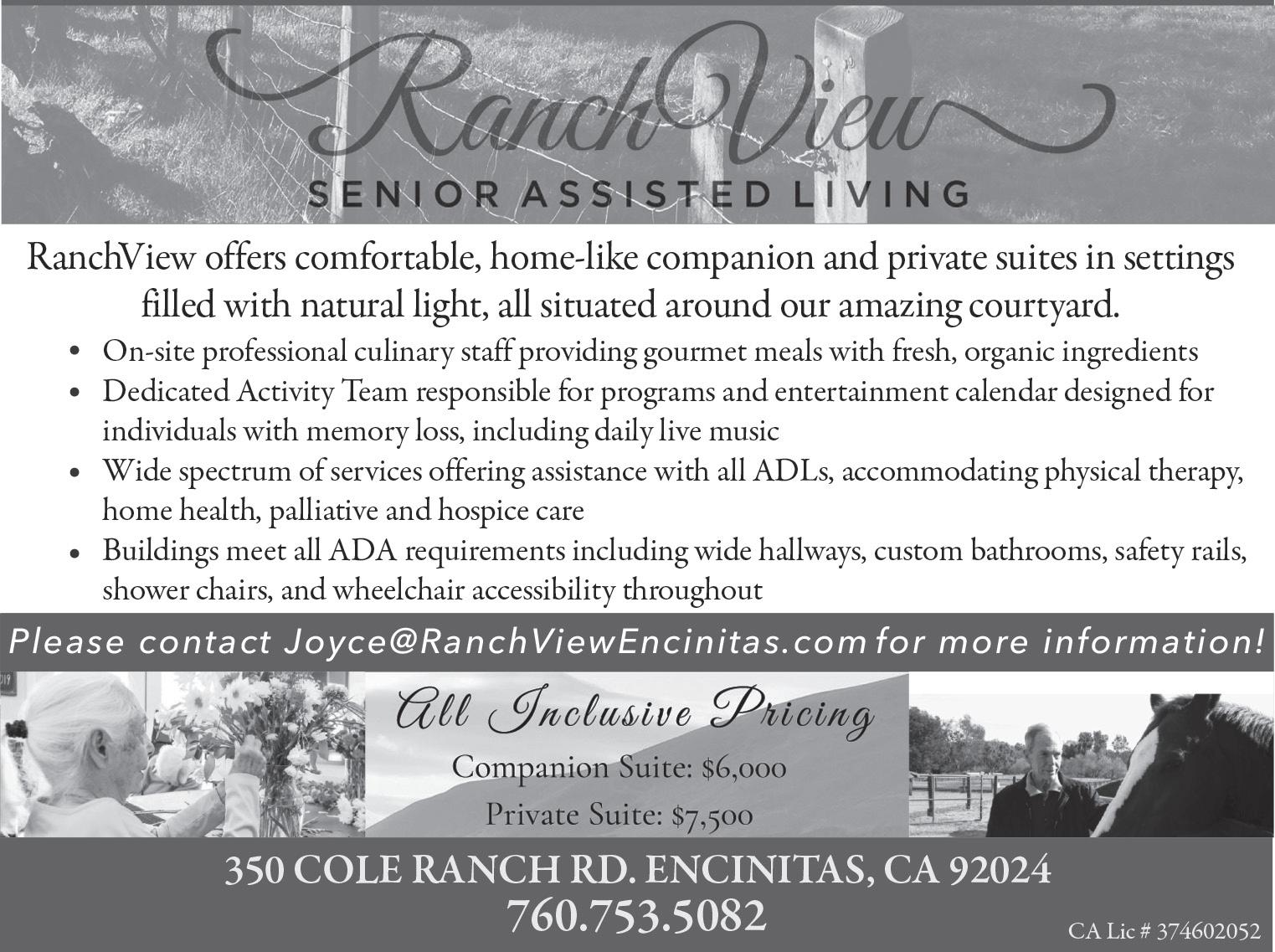 MARCH 24, 2023 T he C oas T N ews 3 Diamonds - Gold - Silver - Since 1972 Full Service Jewelry Repairs $100 OFF Any Purchase Over $250 With This Ad Free Jewelry Polish & Cleaning With This Ad We sell the highest quality lab-grown diamonds Master Jeweler on site 2907 Carlsbad Blvd., Carlsbad • 760-994-0359 A new way of Wellness & Emergency care for your pets! FREDDIE’S PLACE is not about profits, we are about a sincere desire to help every pet who enters. We treat you like family when you need it most. FreddieSez Quality Pet Care is now Affordable keeping the ball rolling 760-FREDDIE 2395 S. Melrose Dr. Vista, CA 92081 woof@freddiesplace.com www.freddiesplace.com Follow us on Dine In, Pickup, Delivery & Catering Delivering all of Carlsbad & Encinitas (Gluten Free options) Encinitas • 760-942-2222 • Carlsbad • 760-434-2222 • LeucadiaPizza.com WE’RE MORE than just GREAT PIZZA Relaxed, Casual & Delicious Salads. Pastas.Sandwiches.