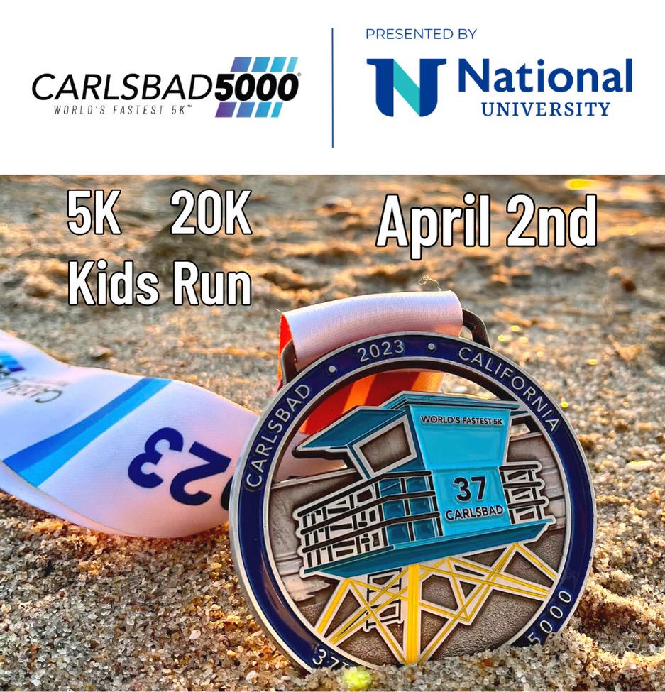This iconic road race features nearly two miles along the Pacific coastline overlooking the sand and surf of the Carlsbad beaches. This legendary flat and fast course kicks off on the downtown seaside streets, winds through palm trees along Carlsbad Blvd., and ends with an exciting, spectatorfriendly finish in the heart of Carlsbad Village. The finish line is alive with a celebratory atmosphere knowing that racing history is often made right on these very streets in our downtown. Come out and cheer on the novice runner and the professional alike.