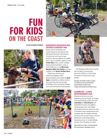 MANGROVE MOUNTAIN AND DISTRICTS COUNTRY FAIR Enjoy country hospitality and community at its very best at The Mangrove Mountain and Districts Country Fair with cows to pat, ponies to ride and alpacas to cuddle. Learn how to handle a python at the Snake Man show, watch a sheepshearing demonstration, enter a homemade cart in the Mountain Mayhem Billy Cart Derby and have a laugh at the Great Chicken Race. They’ll have farming and machinery displays, horse demonstrations and authentic Dark Ages re-enactors as well as clowns, face painting and carnival rides (including a new horizontal bungee racer and mechanical bucking bull!).