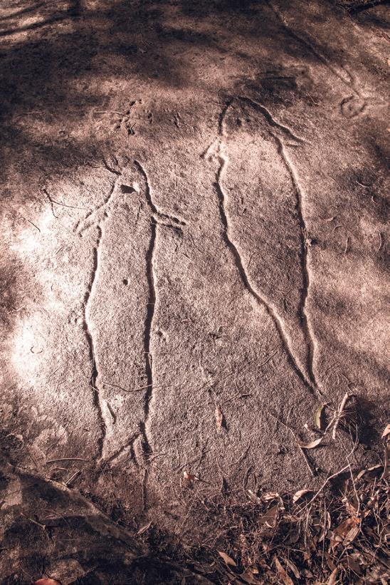 The engravings by the original inhabitants of the Central Coast – the Darkinjung people, as well as the Awaba people to the north – depict wildlife, human figures and mundoes (human footprints) but can also contain images of sacred spiritual beings and ancestral heroes. In the southern end of the region, there is one mystical, human-like figure with multiple bulbous ‘heads’ that is one of only four such recorded figures in the entire greater Sydney basin.