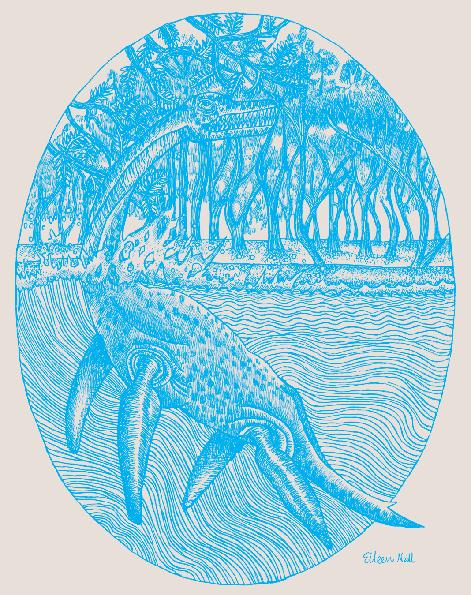 Aboriginal rock engravings around 4,000 years old beside the Hawkesbury River (Deerubbin or Dyarubbin), depict a long-necked, fourflippered creature with a long tail that is thought to be an egg-laying plesiosaur – supposedly extinct 65 million years ago. European settlers in the 1880s were told of Aboriginal women and children being attacked by a giant serpent called a Moolyewonk, ‘a monster that lives in the water’. The most visible engravings of one are on a cliff at Wisemans Ferry and on sandstone cliffs in Woy Woy.