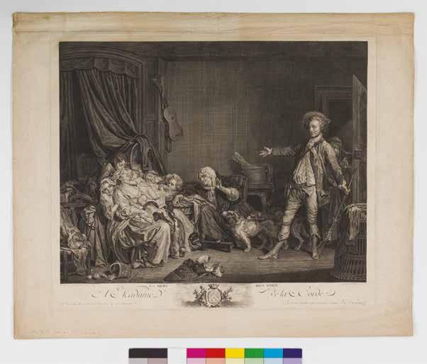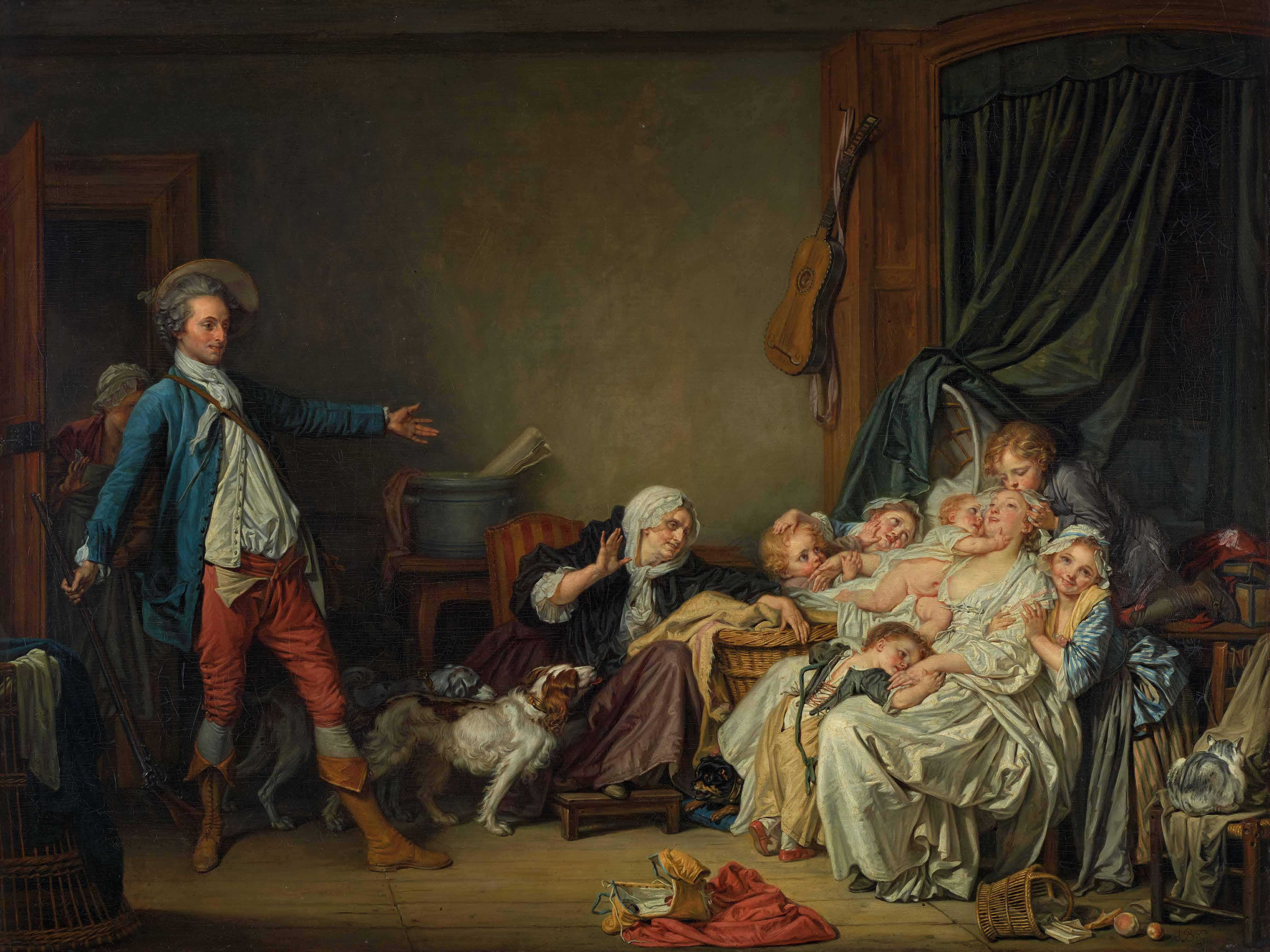 Au Salon de 1769, alors que Greuze présente son Caracalla1 qui ne rencontre pas le succès escompté, un tableau se fait remarquer par son absence. « Le livret annonce La Mère bien-aimée caressée par ses enfants, mais ce morceau dont j’ai entendu dire monts et merveilles n’a point été exposé2 » écrit Diderot. En effet, il semble que son propriétaire, le marquis Jean-Joseph de Laborde (1724-1794), n’ait pas souhaité se dessaisir de son tableau le temps de l’exposition, ce qui fut largement critiqué par les contemporains3 . Fermier général et banquier de la Cour, le marquis de Laborde est l’un des hommes les plus riches de France. Il épouse en 1760 Rosalie de Nettine (1737-1820) avec qui il aura six enfants. Dans La Mère bien-aimée4 [ill. 1], Greuze le représente au retour de chasse, découvrant avec plaisir sa femme et sa belle-mère entourées d’une multitude d’enfants, dans une atmosphère intimiste où tout concourt au bonheur familial. Cette « fiction rustique5 » correspondait au goût des contemporains qui y trouvaient une sincérité bien différente des pastorales de François Boucher (1703-1770).