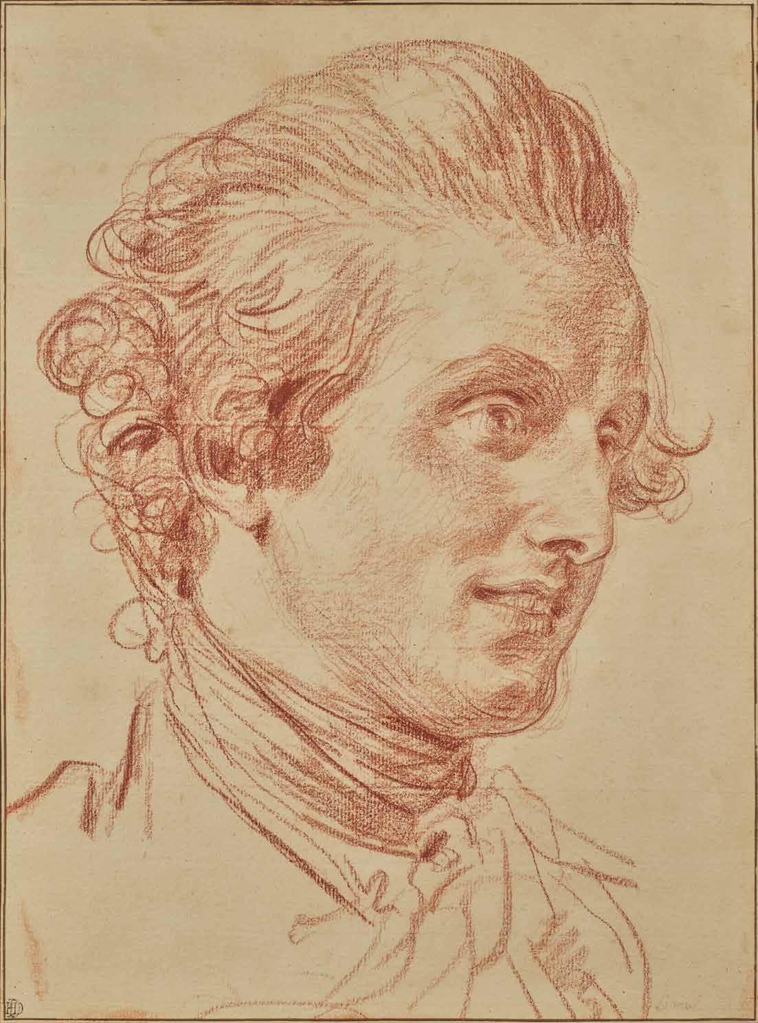 Malgré les réticences de Greuze – dues selon Grimm aux malheurs de son propre ménage 9 –, le dessinateur va transformer la scène en un portrait de famille, en donnant à son personnage les traits du marquis de Laborde. Pour adapter sa composition, Greuze étudie le visage du marquis dans une séduisante et puissante sanguine qui le montre le visage de trois quarts, une cravate de mousseline nouée autour du cou [cat. 1] Le regard vif, la bouche entrouverte, il esquisse un léger sourire. Jean-Joseph de Laborde est bien reconnaissable avec son large front et sa physionomie chaleureuse. Il est légèrement plus âgé que dans son portrait peint au pastel en 1763 par Alexandre Roslin (1718-1793) qui le représente de trois quarts sur un fond sobre10