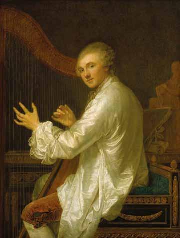 Enfin, si Greuze s’est montré un remarquable portraitiste [ill. 13], il le doit aussi au talent avec lequel il prête vie à ses effigies, non seulement par l’expression du visage mais aussi par l’attitude, le vêtement, le décor, ainsi que les accessoires ou autres attributs, évocateurs d’une activité familière, d’une passion et d’une vie autant sinon plus que de la personnalité qu’elles ont forgée. On pense au Portrait de Claude-Henri Watelet (1718-1786) [ill. 14], receveur général des finances, collectionneur, peintre, graveur et écrivain (1765), assis un compas à la main face à son bureau où sont placés une Venus pudica , un recueil dessiné – ouvert à la page où cette œuvre est reproduite – et un encrier33 , ainsi qu’à celui d’Ange-Laurent de La Live de Jully jouant de la harpe34 .