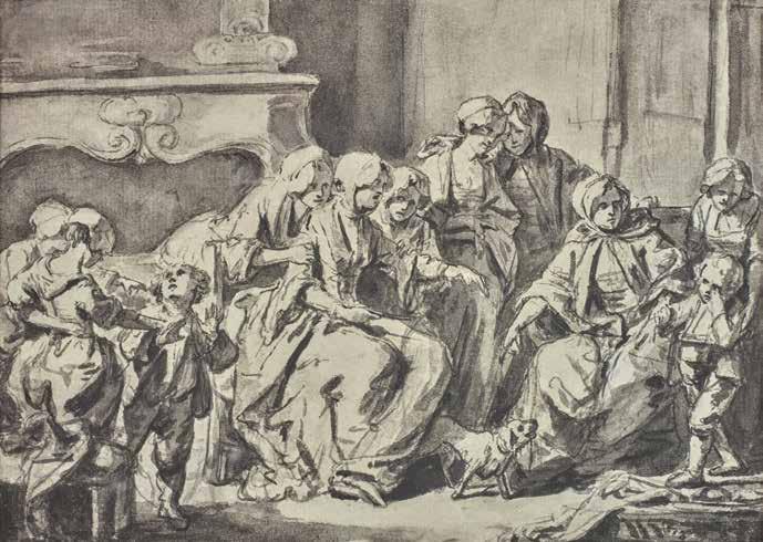 Edgar Munhall 6 a retracé la genèse de cette imposante toile dont l’origine remonte à quelques années auparavant. En 1765, le dessinateur expose en effet au Salon (n˚ 123) une esquisse d’une composition analogue non retrouvée à ce jour, mais préparée par un ensemble de dessins, dont une esquisse pour le groupe autour de la mère ainsi que plusieurs études de figures à la sanguine7