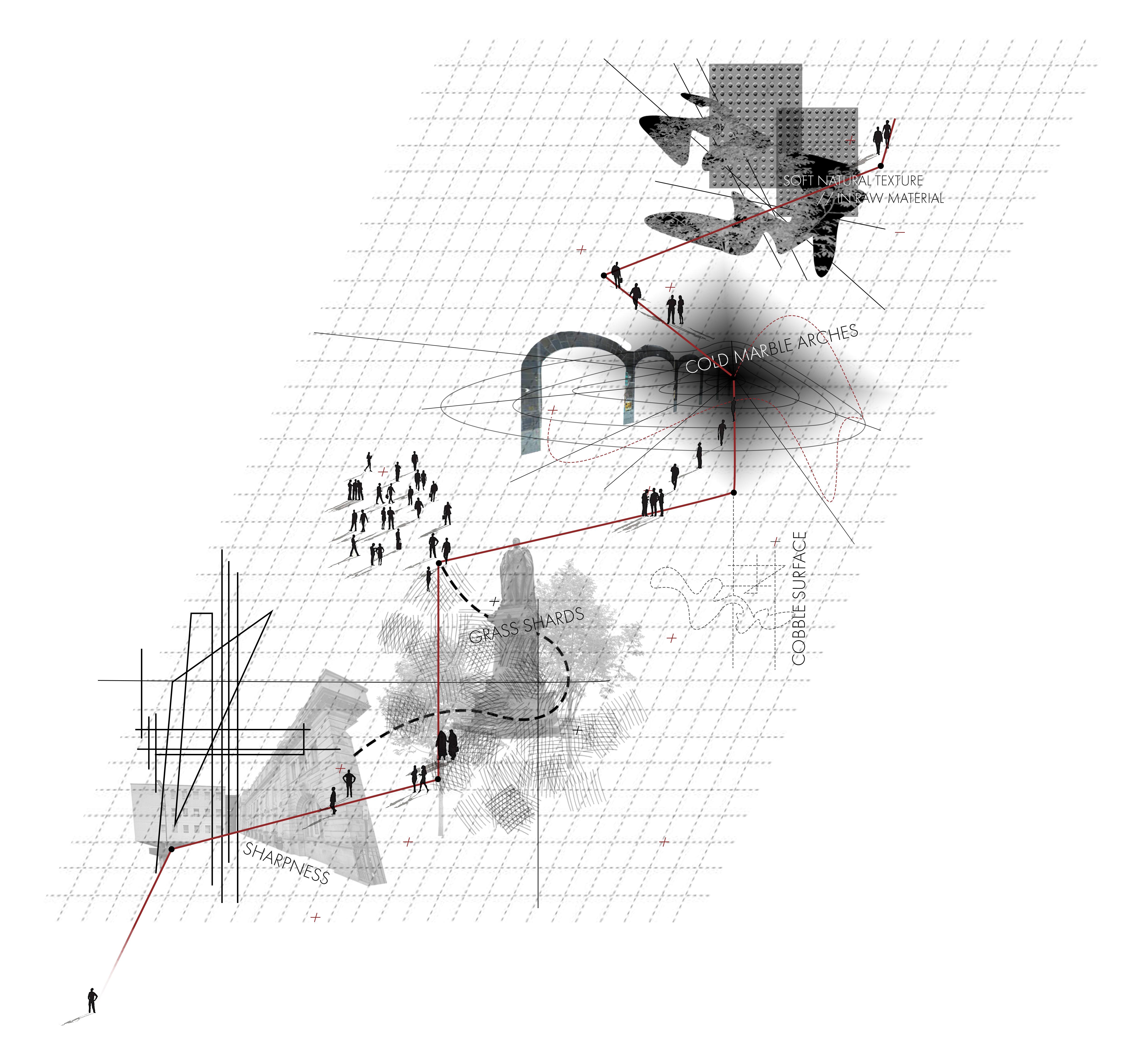 THE JOURNEY THROUGH THE SITE REVEALS CERTAIN ELEMENTS OF TEXTURE AS THE USER MOVES ALONG ITS PATHWAYS.