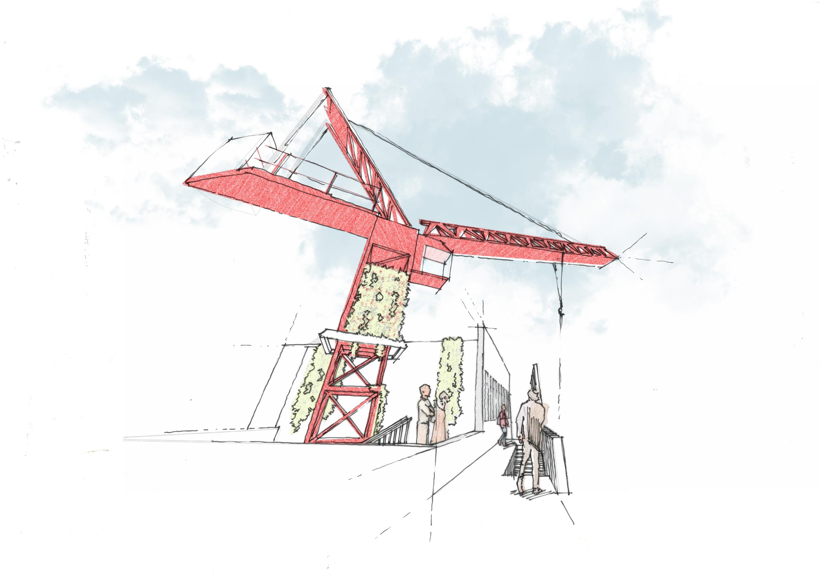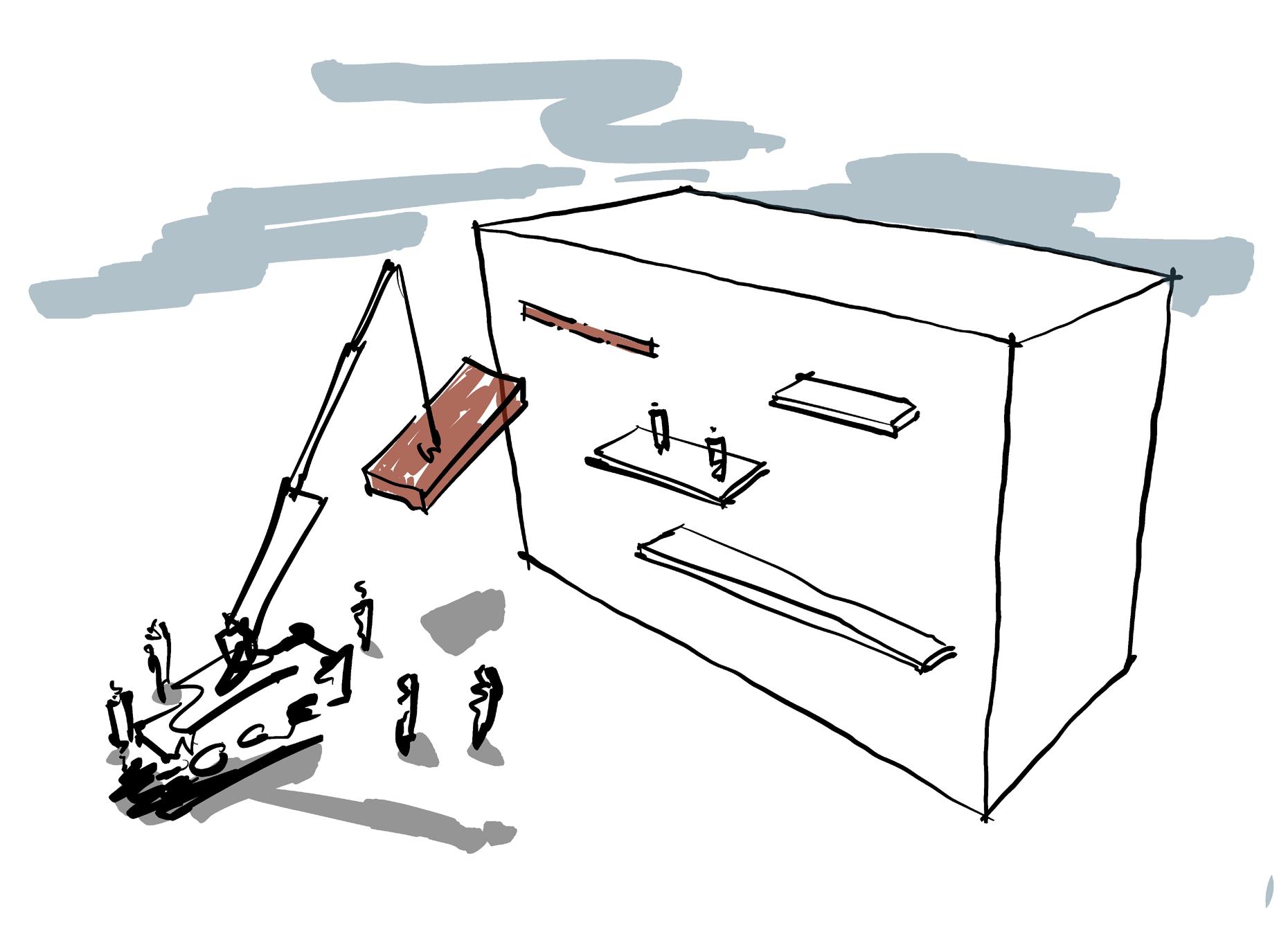 PREFABRICATED FAÇADE UNITS ALLOW FOR FAST CRANE CONSTRUCTION AND CRANE ALLOWS FOR A PERMANTENT FEATURE FOR THE BUILDING FOR DISASSEMBLY IN FUTURE USE OF THE FAÇADE.