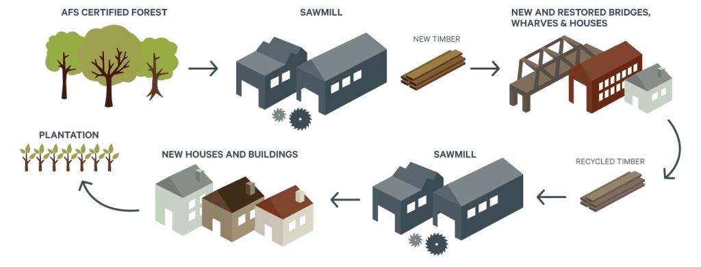LIFECYCLE OF REUSED TIMBER ALLOWS FOR A CIRCULAR ECONOMY AND A RENEWABLE SOURCE OF MATERIAL CONTRIBUTING TO A CIRCULAR ECONOMY WITHIN THE BUILDING.