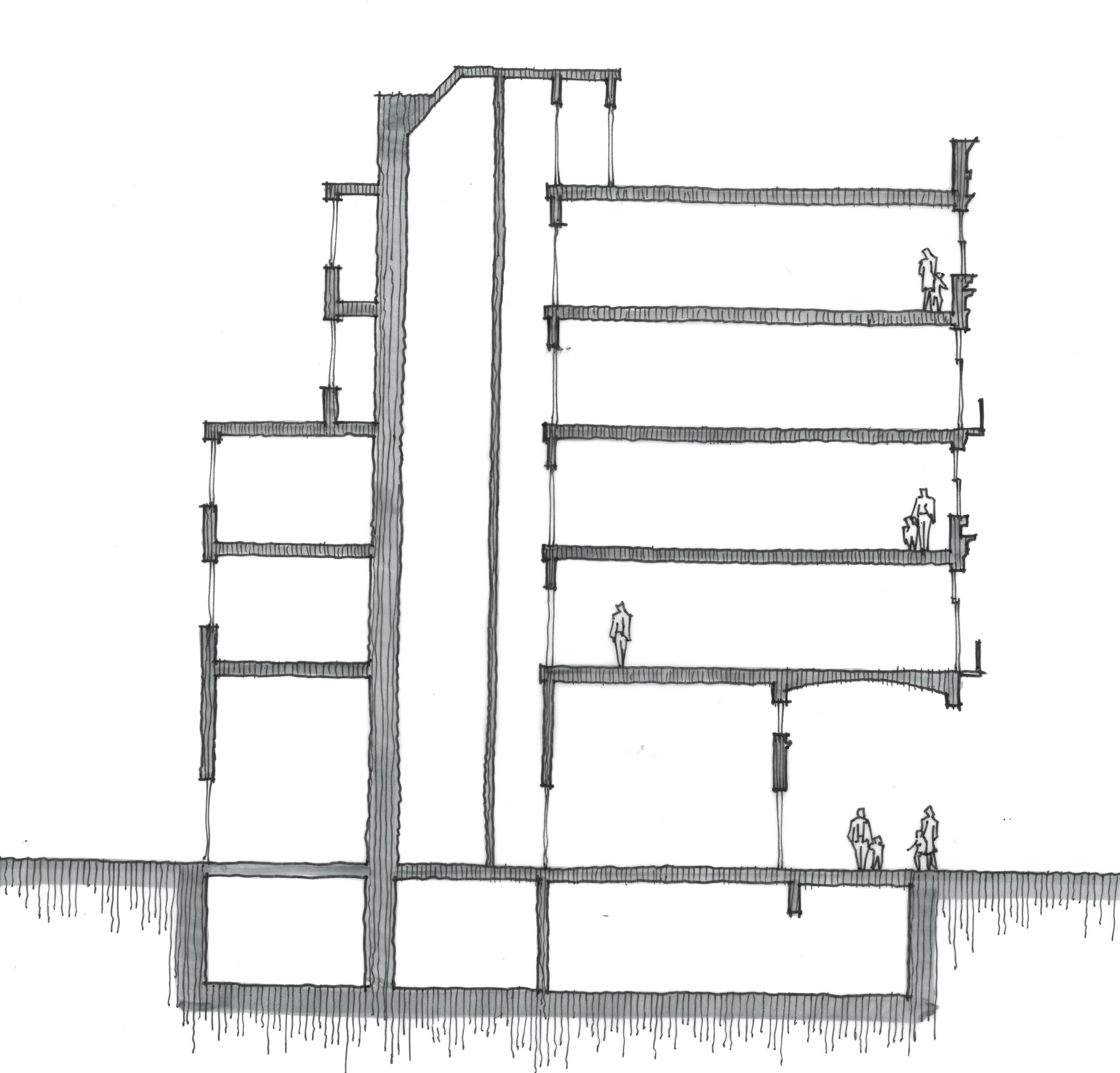 THE CONSTRUCTION OF THE PROJECT INVOLVES MAKING EQUAL SPACE FOR THE OCCUPANTS OF THE HOUSING PROJECT. RATHER THAN SUBTACTING FROM THE BUILDING AND TAKING DOWN THE EXISTING, THE SPACE IS MAINTAINED AND CARED FOR THROUGH A PROCESS OF ADDITIONAL BALCONY SPACES THAT ACT AS A WINTER GARDEN FOR THE OCCUPANTS.