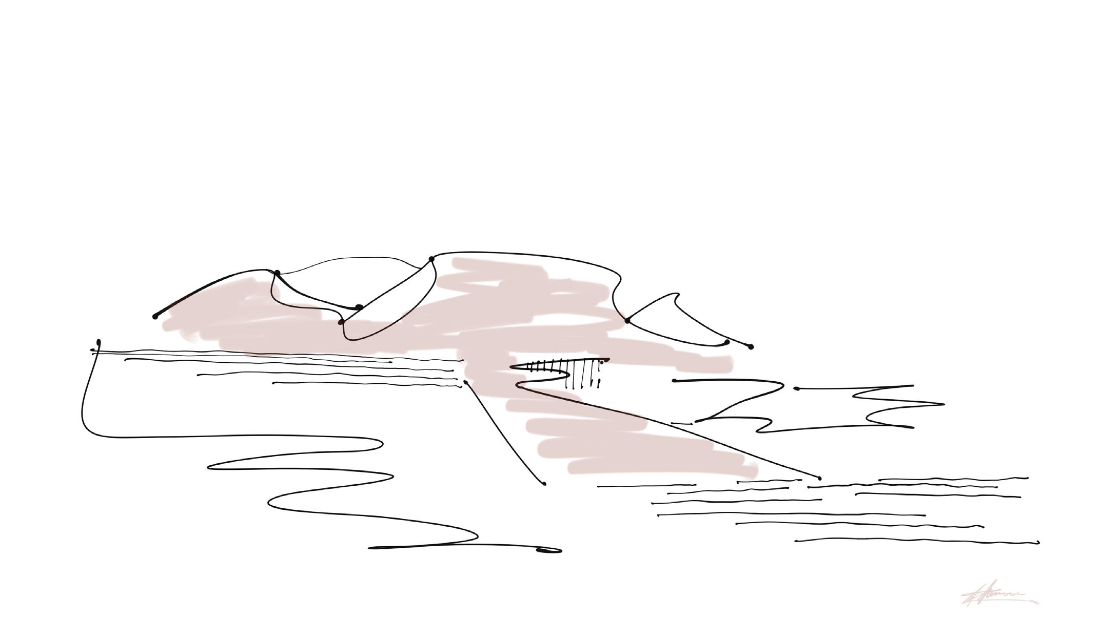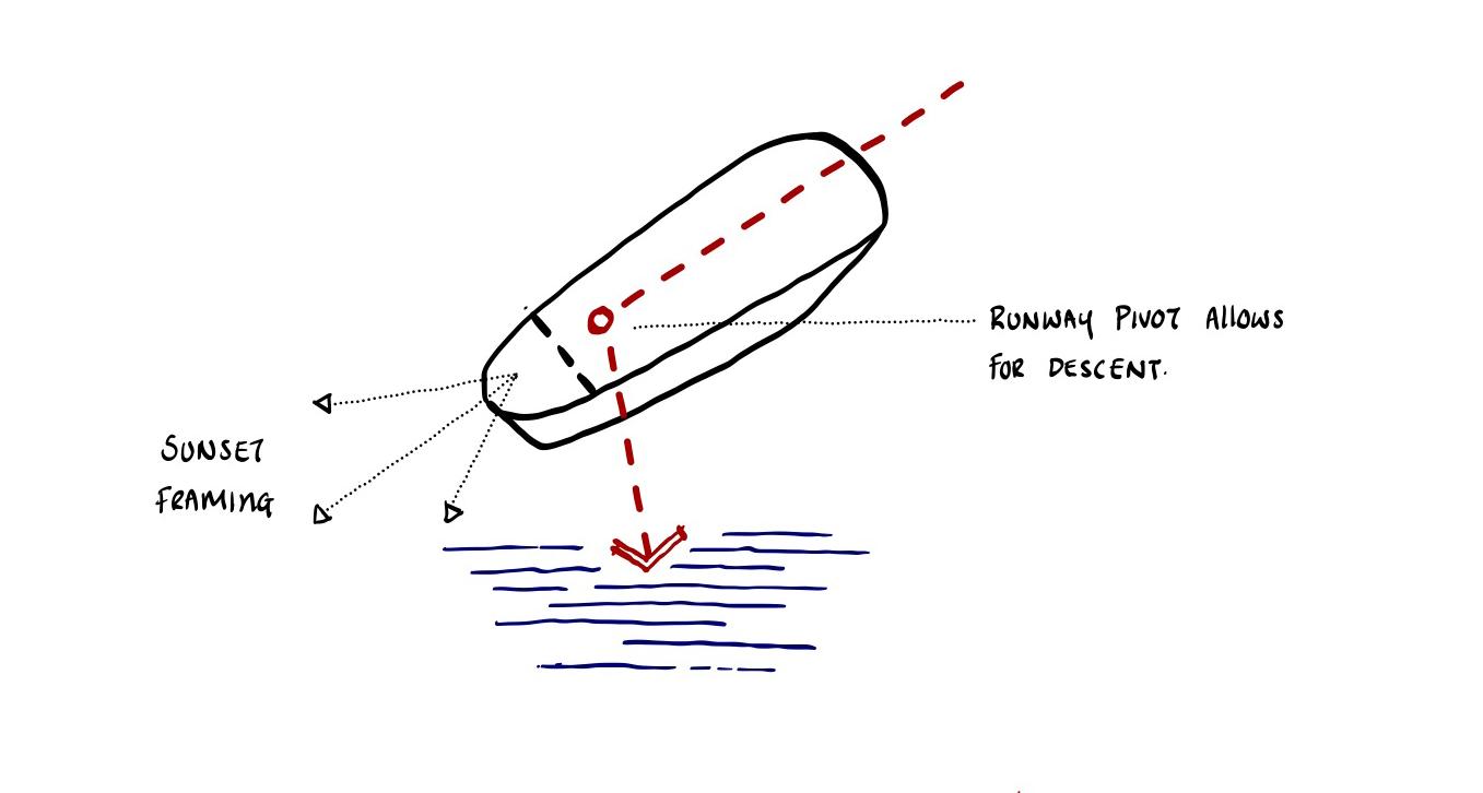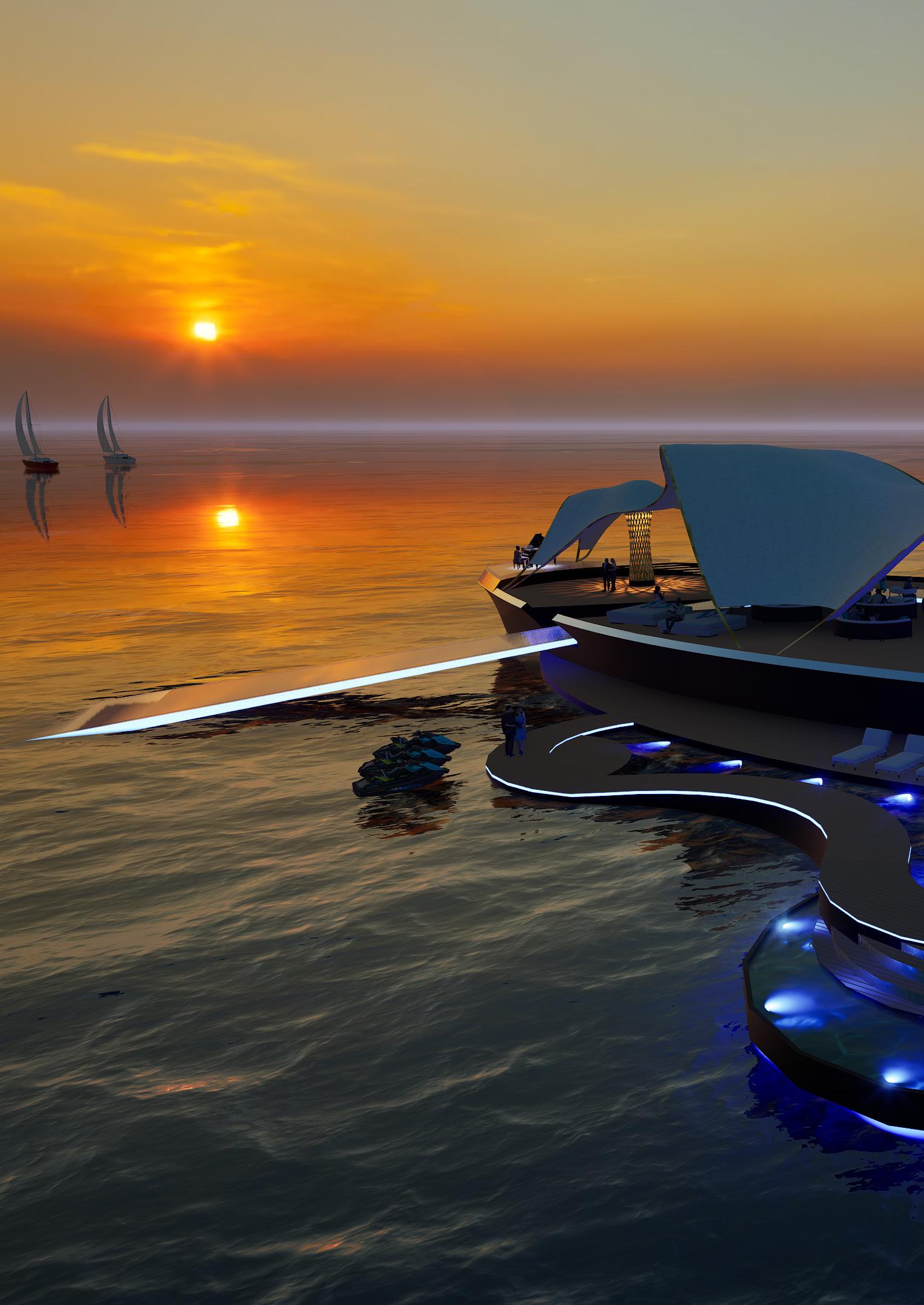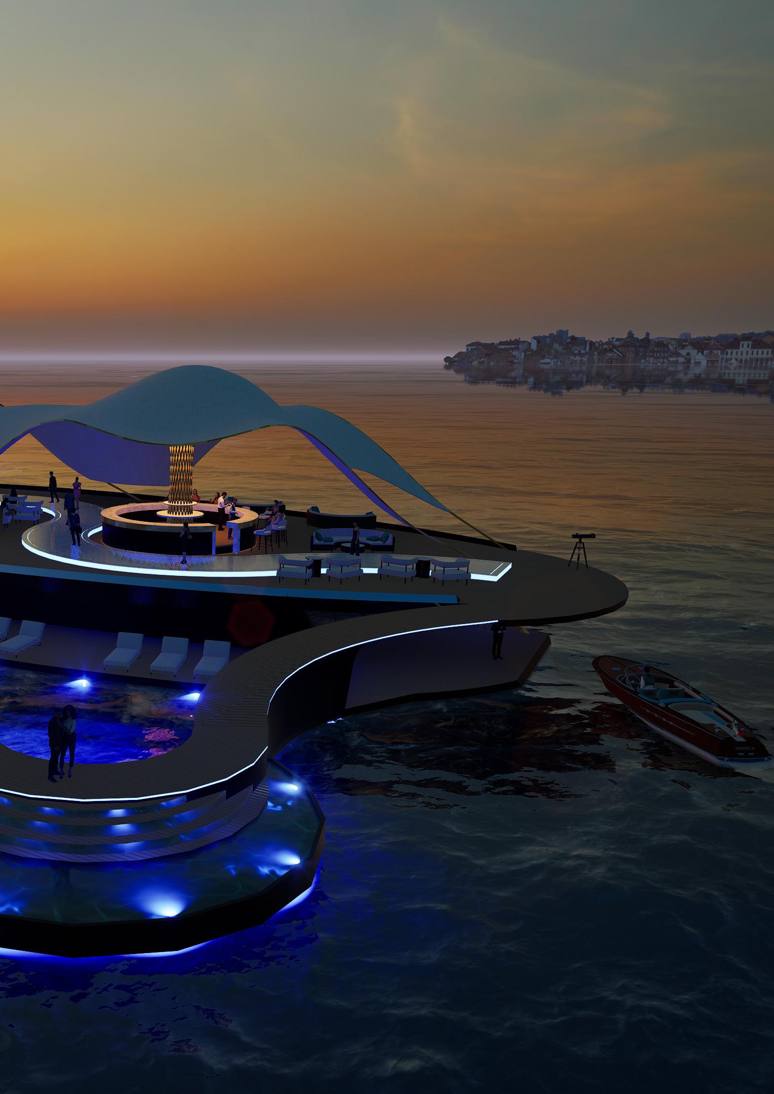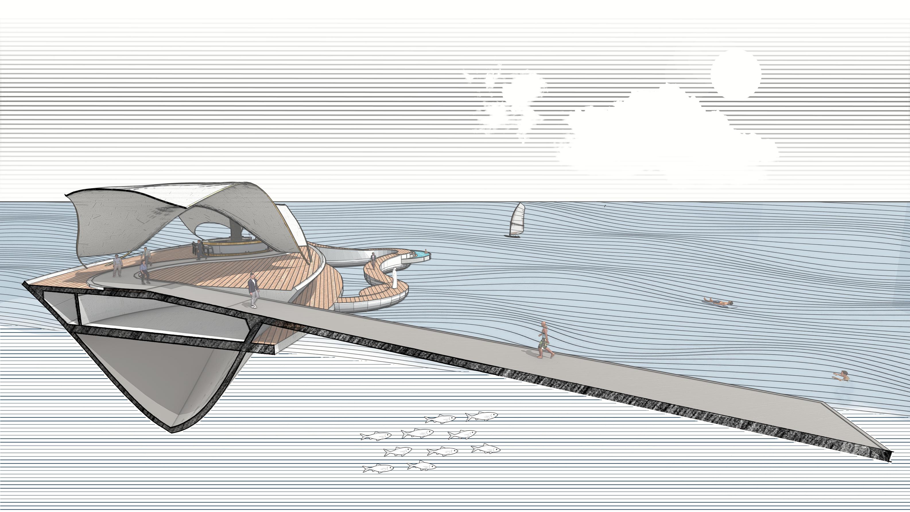 Runway at the Waterline explores architecture as a dialogue between humanity and the ocean. The project investigates the sea as a layered condition — surface, horizon, and immersion — translating these elements into spatial experience upon water. Within the realm of yachting, the vessel is reimagined as floating terrain: a setting for movement, gathering, and performance shaped by wind, light, and tide. Through hand draftsmanship, technological integration, and advanced rendering systems, the work seeks to merge precision with atmosphere.
