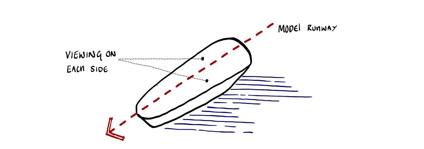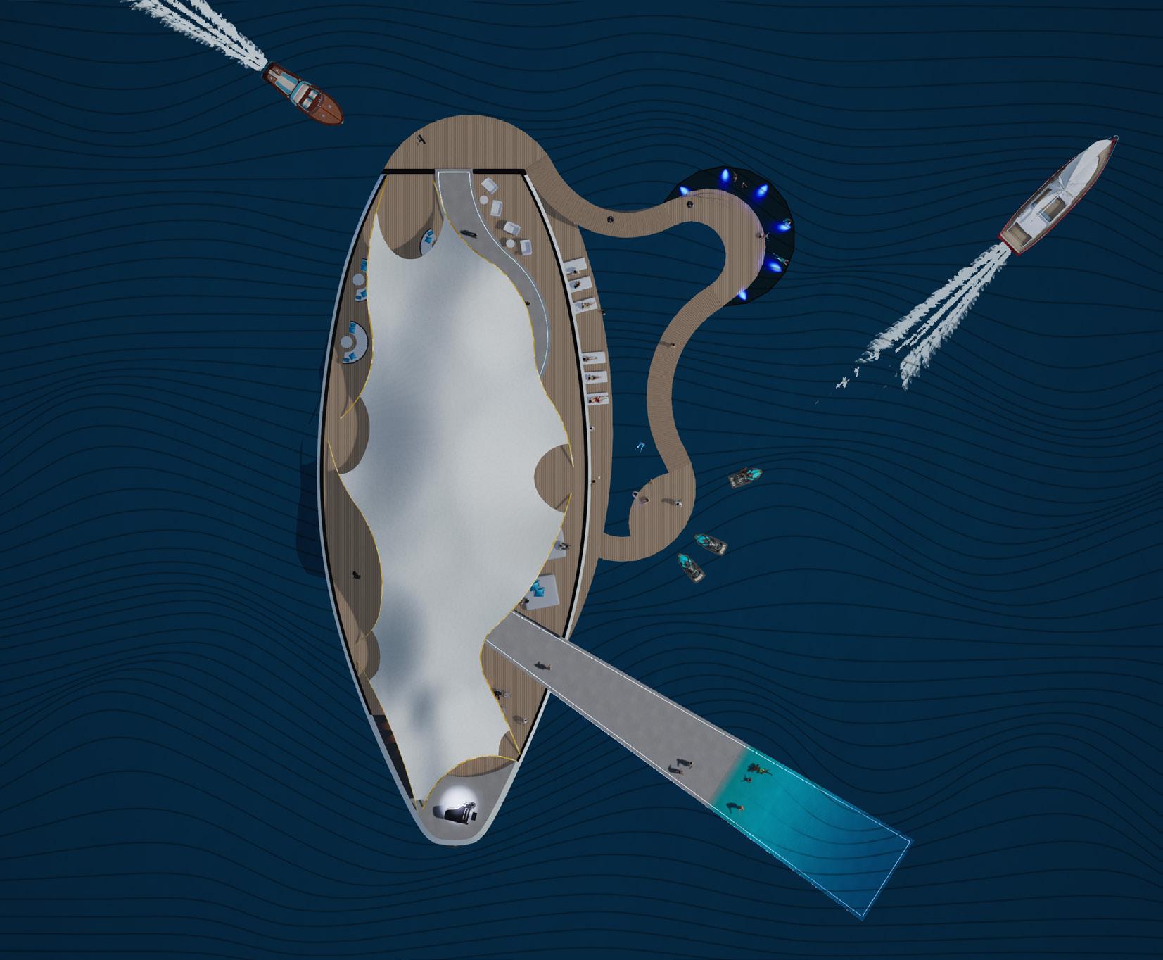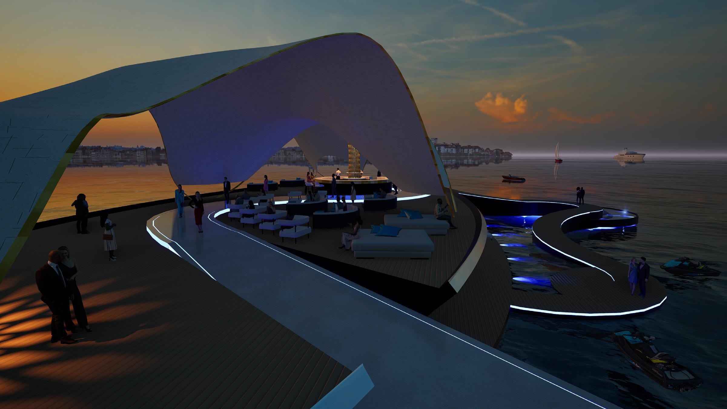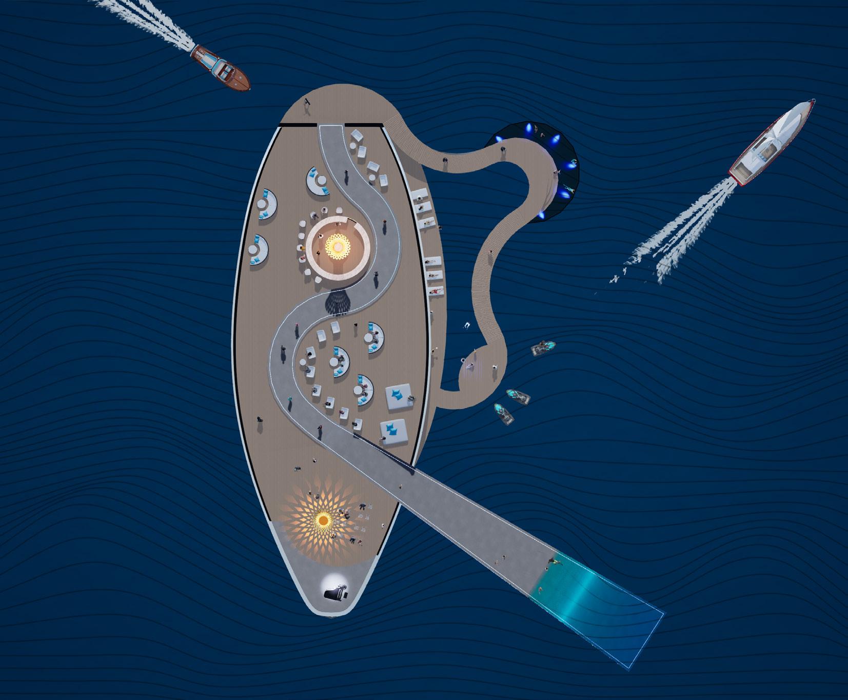 The runway becomes a shifting horizon — rising above the sea, dissolving at the waterline, and descending beneath it. Models move through exposure, reflection, and immersion. Garments encounter wind, salt, light, and pressure as active collaborators in the performance. The ocean is not a backdrop; it is the representation of layers within natures transcendence from Context to Agent. A serpentine walkway extends across a buoyant plane carved by voids that shape spectator pockets. At its centre, a pavilion shelters gathering without enclosing it. The bar anchors the social core, while the runway slips below the surface into a submerged passage — a moment of altered perception where the threshold of movement in water and people is blurred. The architecture does not resist the elements; it choreographs them. Waves brush its edges. Spray crosses its thresholds. The structure accepts erosion, reflection, and instability as layers of beauty. Fashion, like the sea, is transient and atmospheric. This project frames both as temporal phenomena — body, garment, and water intertwined in motion. Here, the show is not only watched. It is felt with the senses of the oceans atmosphere.