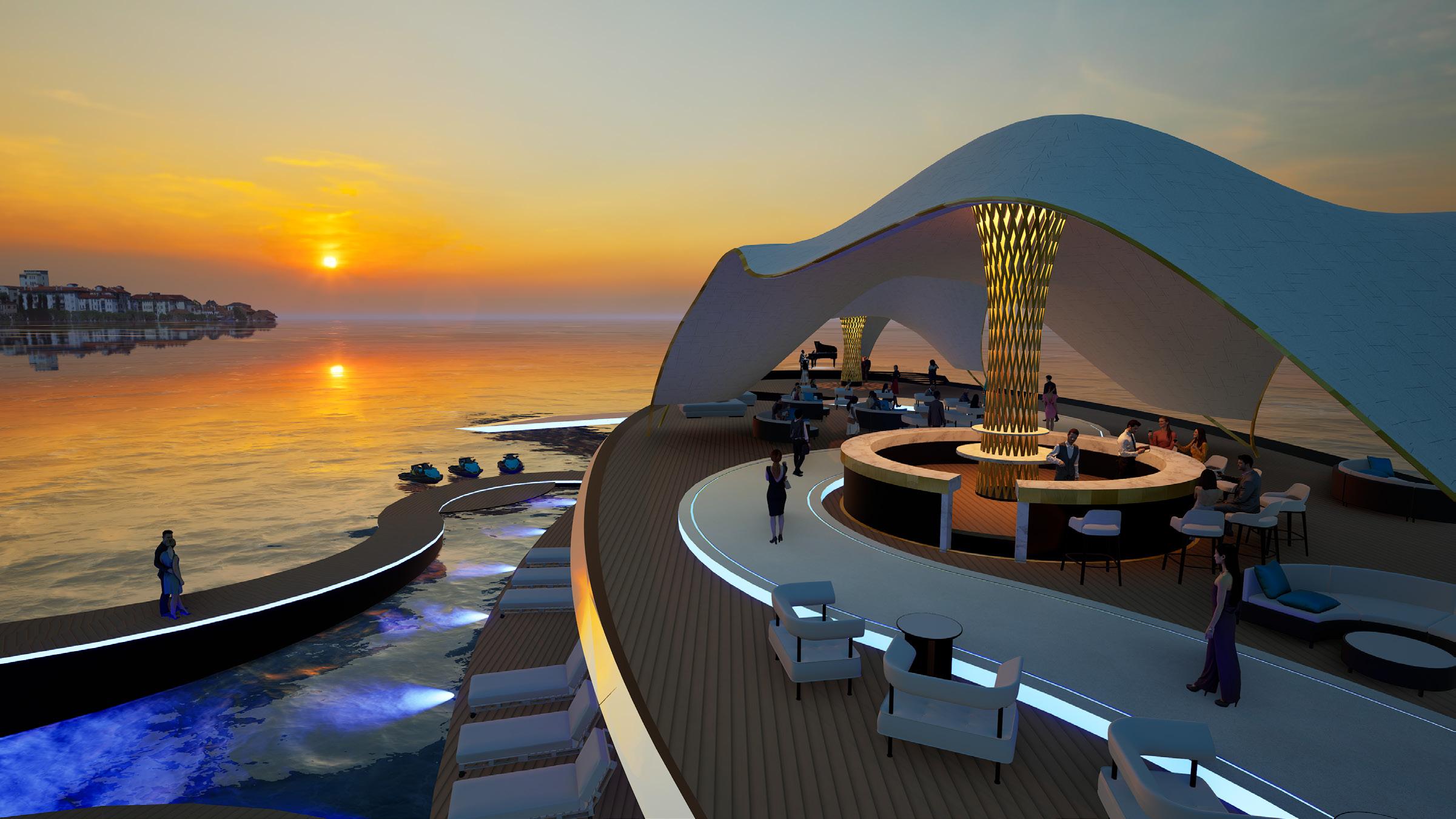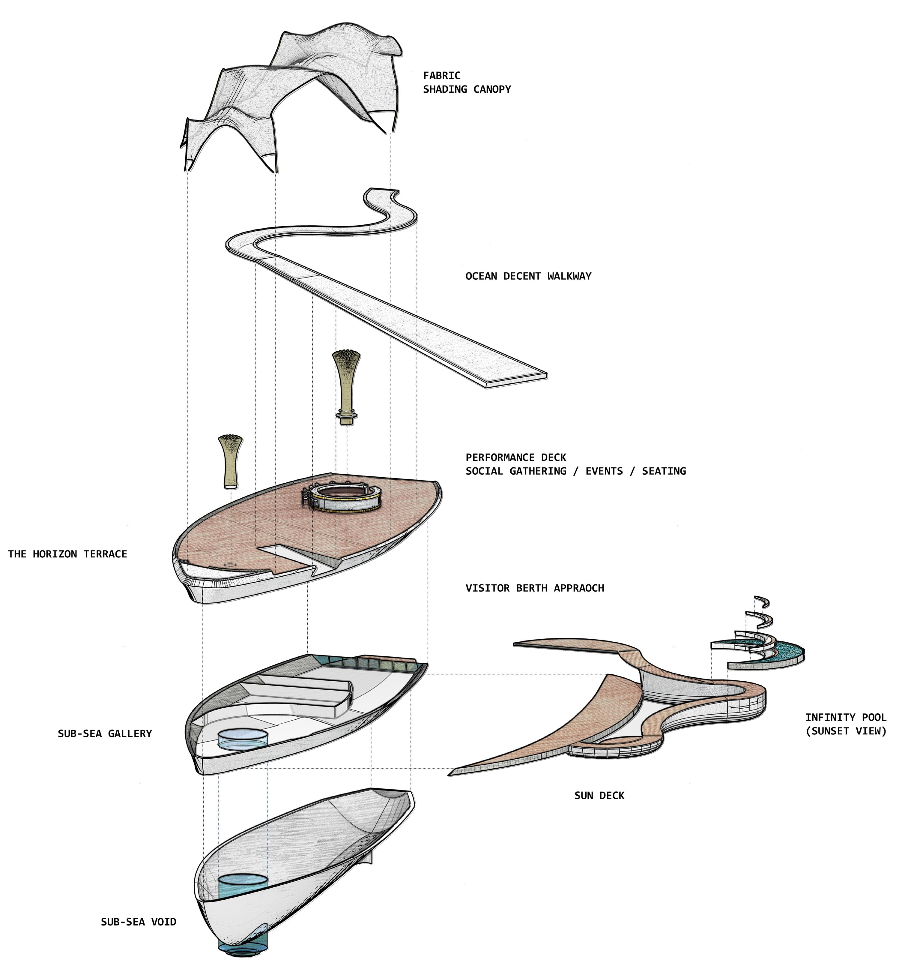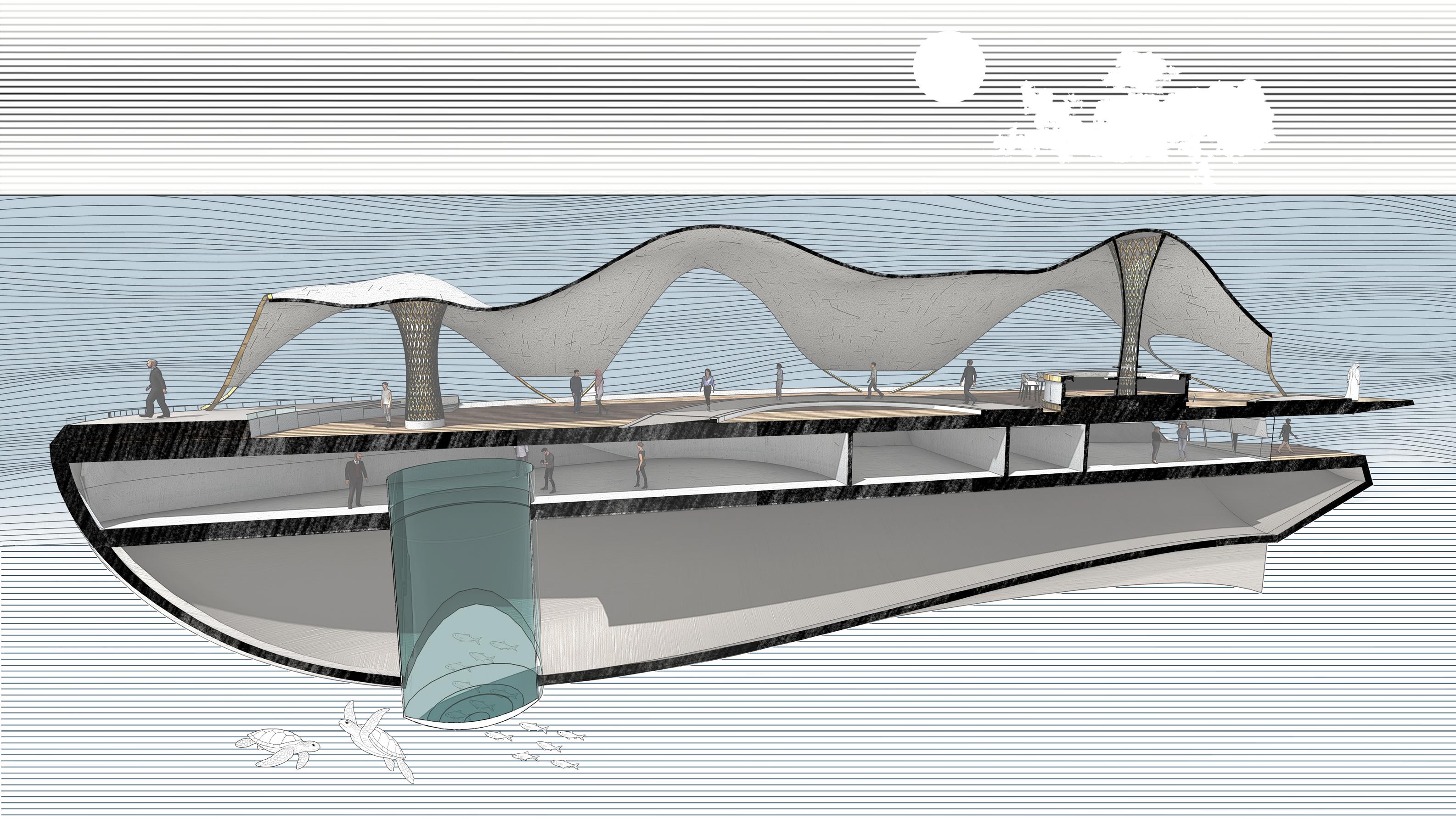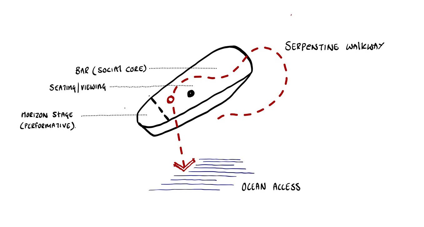 The runway becomes a shifting horizon — rising above the sea, dissolving at the waterline, and descending beneath it. Models move through exposure, reflection, and immersion. Garments encounter wind, salt, light, and pressure as active collaborators in the performance. The ocean is not a backdrop; it is the representation of layers within natures transcendence from Context to Agent. A serpentine walkway extends across a buoyant plane carved by voids that shape spectator pockets. At its centre, a pavilion shelters gathering without enclosing it. The bar anchors the social core, while the runway slips below the surface into a submerged passage — a moment of altered perception where the threshold of movement in water and people is blurred. The architecture does not resist the elements; it choreographs them. Waves brush its edges. Spray crosses its thresholds. The structure accepts erosion, reflection, and instability as layers of beauty. Fashion, like the sea, is transient and atmospheric. This project frames both as temporal phenomena — body, garment, and water intertwined in motion. Here, the show is not only watched. It is felt with the senses of the oceans atmosphere.