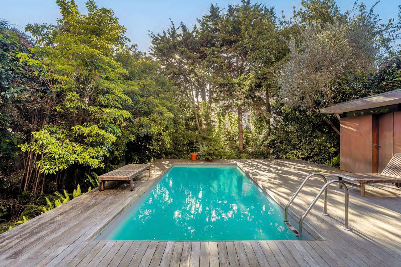 The interior features three bedrooms including a luxurious master suite with walk-in closet, alongside a dedicated office and three bathrooms. The social areas flow seamlessly between formal dining, contemplative reading nooks, and an inviting living room with fireplace, all opening directly onto terraces that blur the boundaries between indoor and outdoor living. The fully equipped kitchen and functional poolside annex with kitchenette ensure