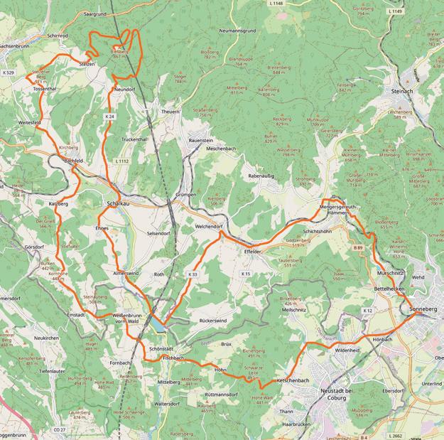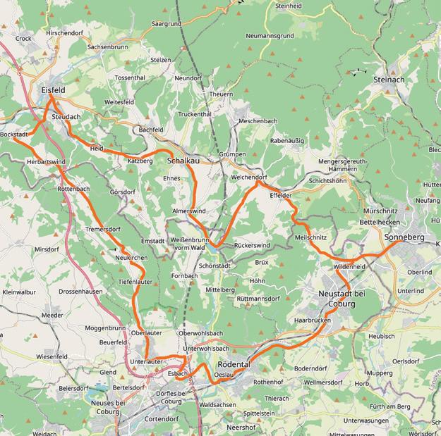 Die ersten zehn Kilometer führt diese Tour entspannt von Sonneberg über Ebersdorf nach Neustadt bei Coburg. Danach geht es auf den Muppberg, den 515 m hohen „Hausberg“ der Neustadter. Während des zweieinhalb Kilometer langen Anstiegs gibt es einige Gelegenheiten für eine Pause, um die müden Beine zu entspannen.