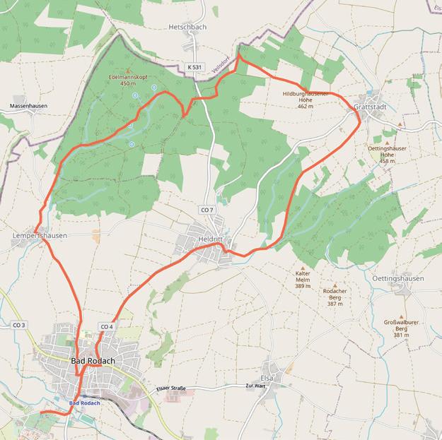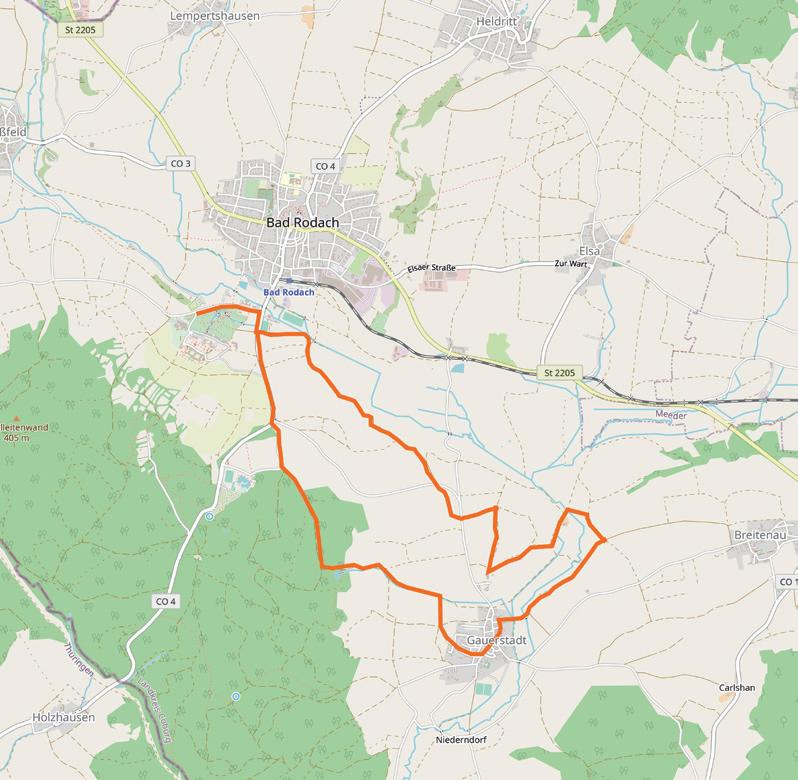 Von Coburg-Zentrum führt die Route zunächst in den Stadtteil Neuses mit der Friedrich-Rückert-Gedenkstätte und dem Naherholungsgebiet Goldbergsee. Zwischen Baumwipfeln thront links Schloss Callenberg. Weiter geht es nach Meeder, einem hübschen Ort mit sehenswerter Laurentiuskirche, einem Fachwerk-Schloss und einem Friedensmuseum. Über Großwalbur und Elsa erreicht man das Etappenziel Bad Rodach mit seiner historischen Innenstadt, die verschiedene Geschäfte, Cafés, ein Heimatmuseum und ein Haus des Gastes bietet. Vor den Toren der Stadt lockt die ThermeNatur, wunderschön eingebettet in die Landschaft und mit Ausblick auf den Georgenberg. Hier können Besucher in aller Ruhe entspannen. Nach einem erholsamen Stopp geht es weiter durch die malerische Landschaft über Gauerstadt und durch den Callenberger Forst. Anschließend führt der Weg nach Weidach und Scheuerfeld, bevor es über den Kürengrund zurück nach Coburg geht.