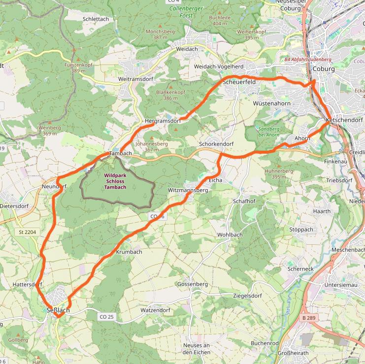 Der Abschnitt im Coburger Land startet in Seßlach. Über das Rodachtal mit der Veste Heldburg und Ummerstadt führt die Route zum Coburger Marktplatz. Dieser eignet sich perfekt für eine Pause, bevor es zur Veste Coburg geht. Die Tour führt weiter nach Ebersdorf bei Coburg und anschließend über Neuensorg nach Weidhausen.