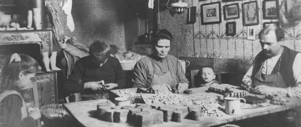 Heimarbeiterwerkstatt, Familie bei Verarbeitung von Papiermaché, 1900