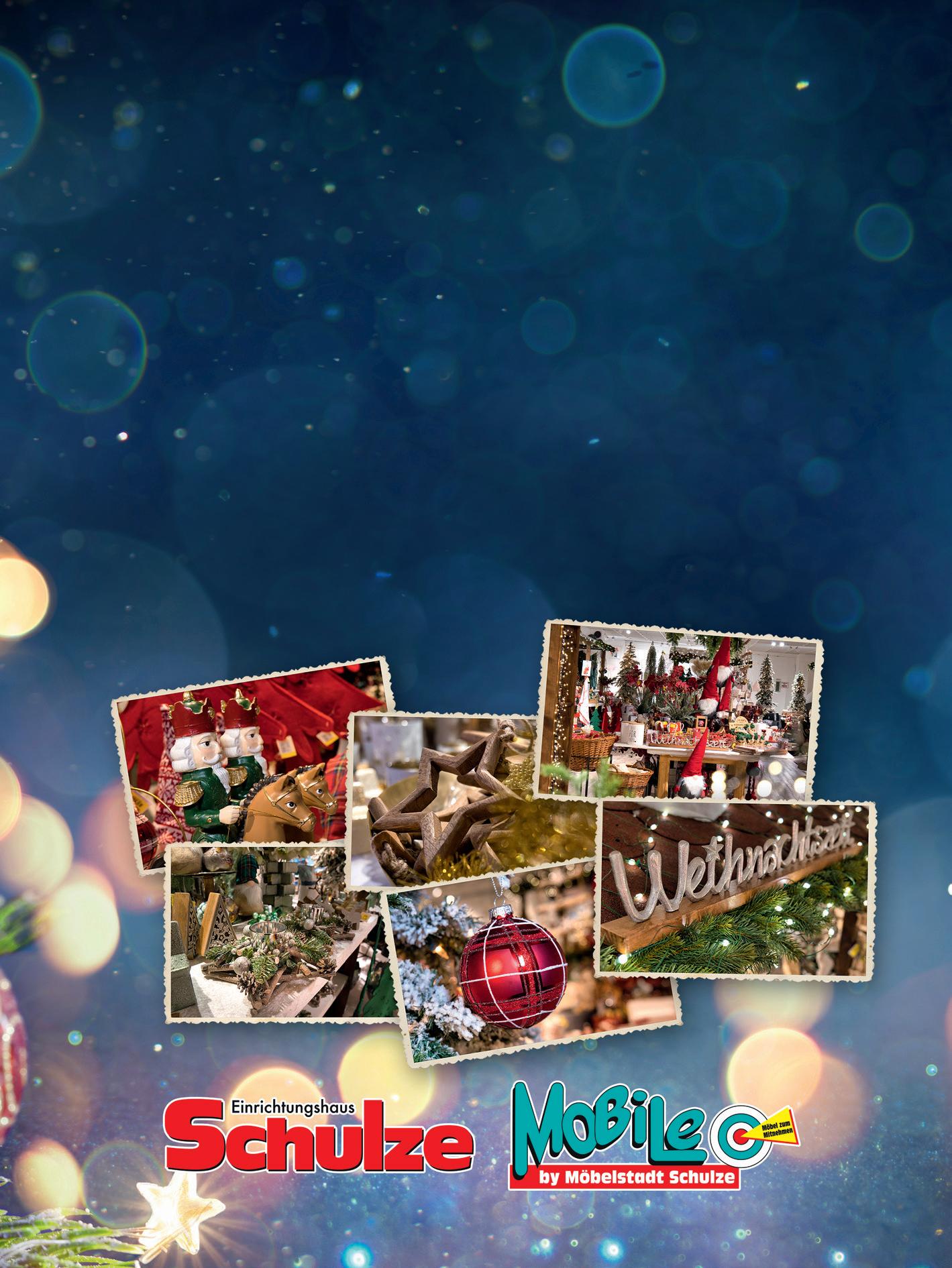 Porzellan für den Tisch. Und wer sich nach dem entspannten Shoppingerlebnis noch mit leckeren warmen und kalten Getränken und Gerichten für den großen und kleinen Hunger verwöhnen lassen möchte, besucht eines unserer gemütlichen Bistros. Die Weihnachtsmärkte in der Möbelstadt Schulze sind während der normalen Öff nungszeiten von Montag bis Freitag von 9 bis 19 Uhr und am Samstag von 9 bis 18 Uhr geöff net.