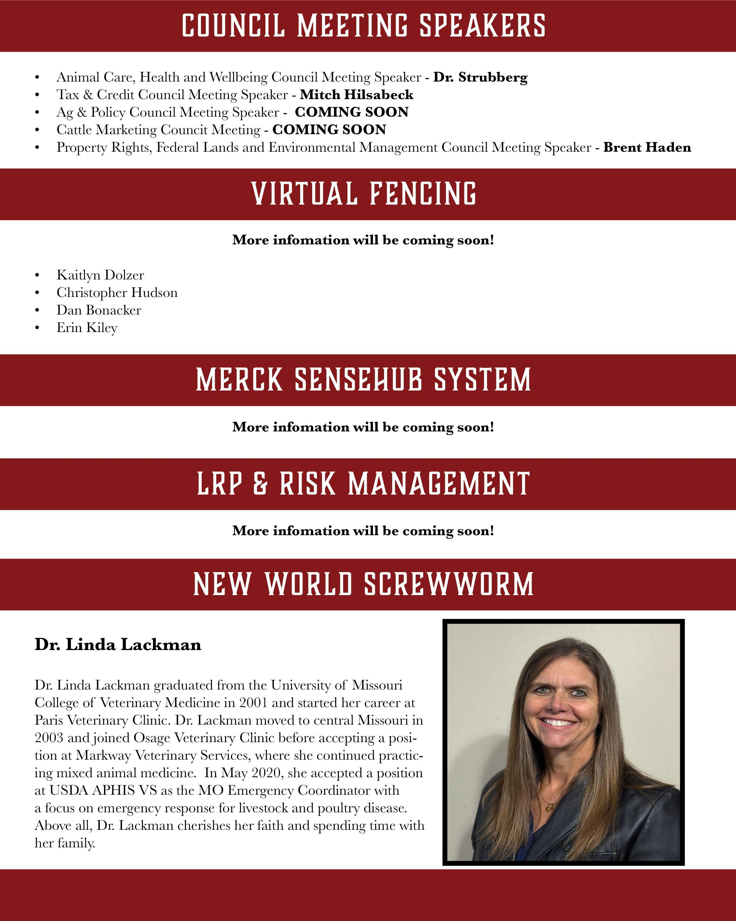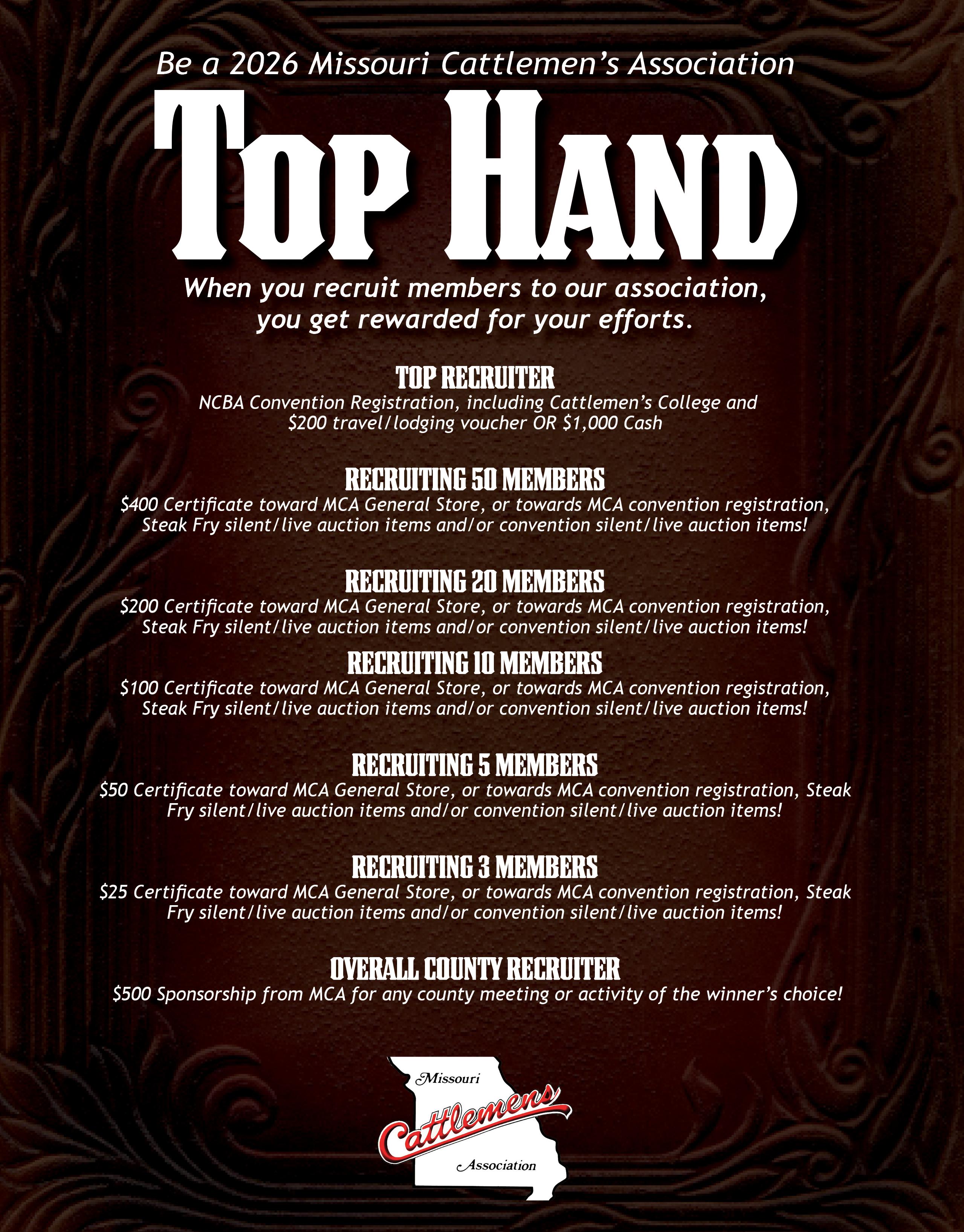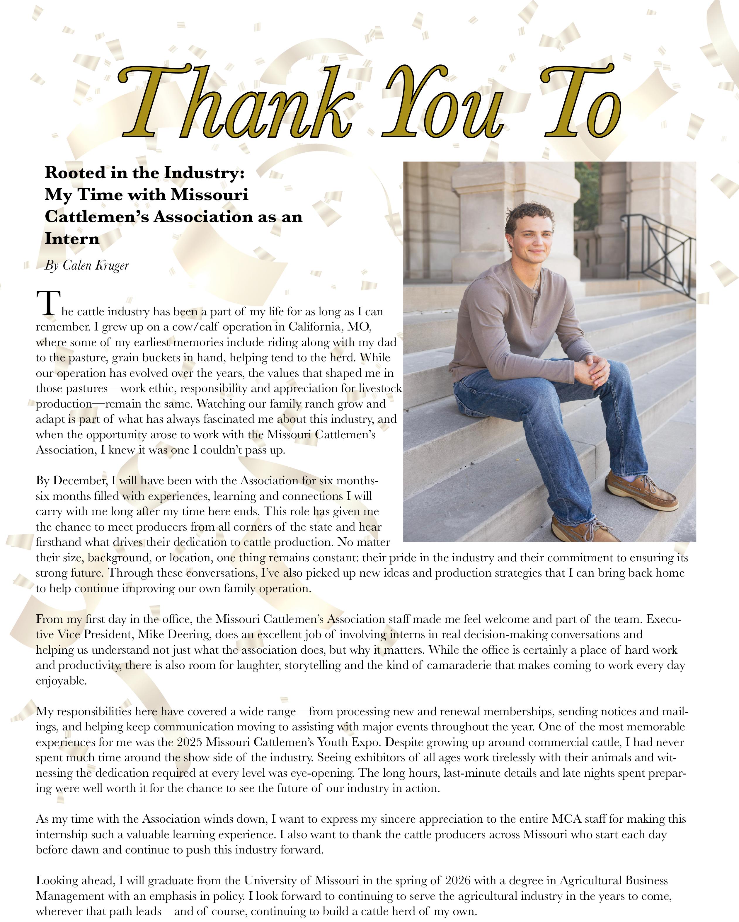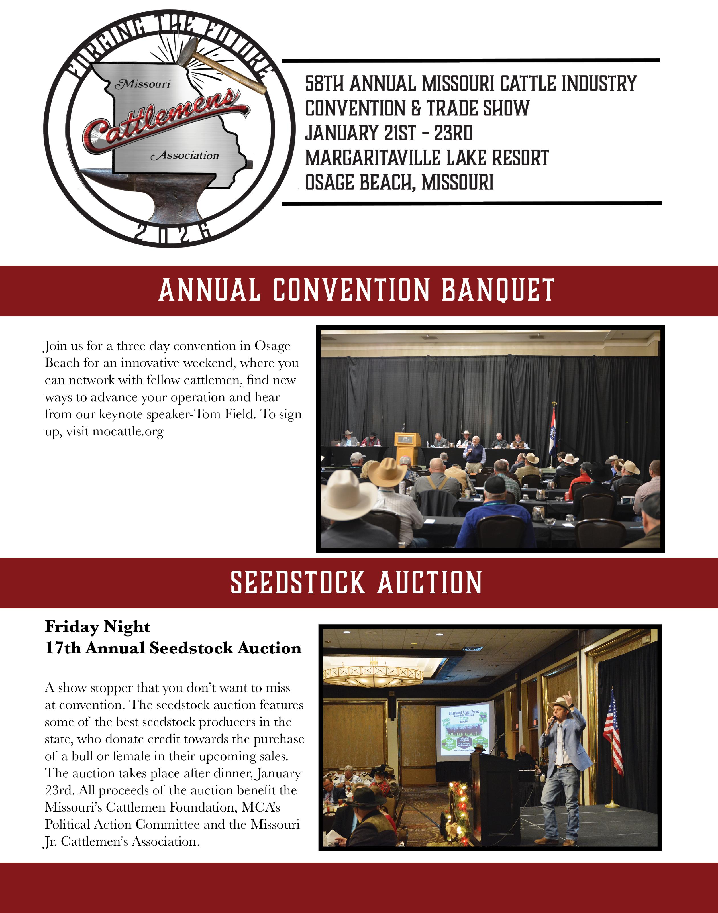 We are just a few short months away from the Annual Missouri Cattle Industry Convention & Trade Show. Cattle producers and industry partners from across the state will gather to discuss policy, learn about new technologies, catch up with old friends, and see some new faces along the way. The theme for this year is “Forging the Future” as we navigate the ever-changing terrain of the beef cattle industry together. The convention is set to take place on January 21st to the 23rd, 2026. Registration is open and available online at mocattle.com. For more details, please see PAGE 25-39.