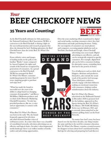 BEEF CHECKOFF NEWS 35 Years and Counting! As the Beef Checkoff celebrates its 35th anniversary, the National Cattlemen’s Beef Association (NCBA), a contractor to the Beef Checkoff, is shining a light on the successful promotion and research programs that drive the demand for beef. Nothing epitomizes the Beef Checkoff more than the iconic Beef. It’s What’s For Dinner.® brand. From celebrity voices and images of sizzling steaks on the grill, to the familiar “Rodeo” music composed by Aaron Copland, the sights and sounds of the brand are recognized by generations of consumers. As a proud contractor to the Beef Checkoff, NCBA has managed the Beef. It’s What’s For Dinner. consumer marketing program for more than 27 years, inspiring people to purchase and enjoy beef.