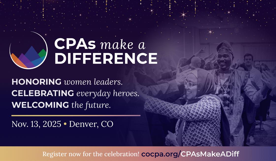 NewsAccount (ISSN #10899952) is published quarterly by the Colorado Society of Certified Public Accountants, 720 S. Colorado Blvd., Suite 500N, Glendale, CO 80246. NewsAccount is published in Winter, Spring, Summer, and Fall and reports information, news, and trends in the accounting profession. The Colorado Society of CPAs assumes no liability for readers’ business decisions in reference to advertisements or other information included in this publication. Links to external websites are provided for convenience and are not under the control of the COCPA. The inclusion of such links does not constitute an endorsement of the content or the views expressed therein.