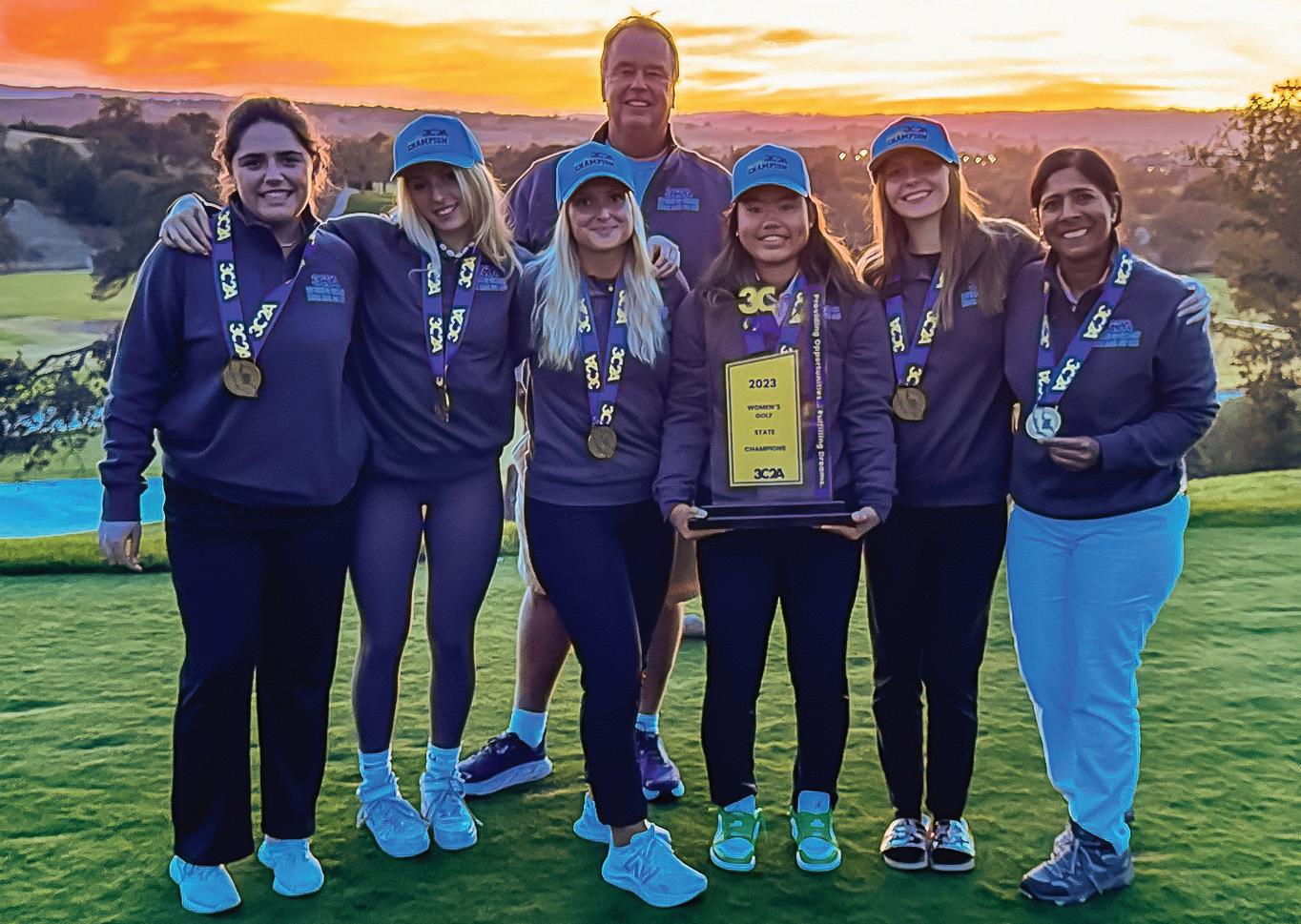 The Women’s Golf Team won the 2023 state championship. Players included (from left) Elena Ortuno-Maltalban, Flora Peugnet, Linnéa Nilsson, Motoko Shimoji, Brooke Maxwell, and Nisha Gaulke. The team was coached by Gary Peterson (back row), who has won 15 state titles with the Men’s and Women’s Golf Teams at College of the Canyons.