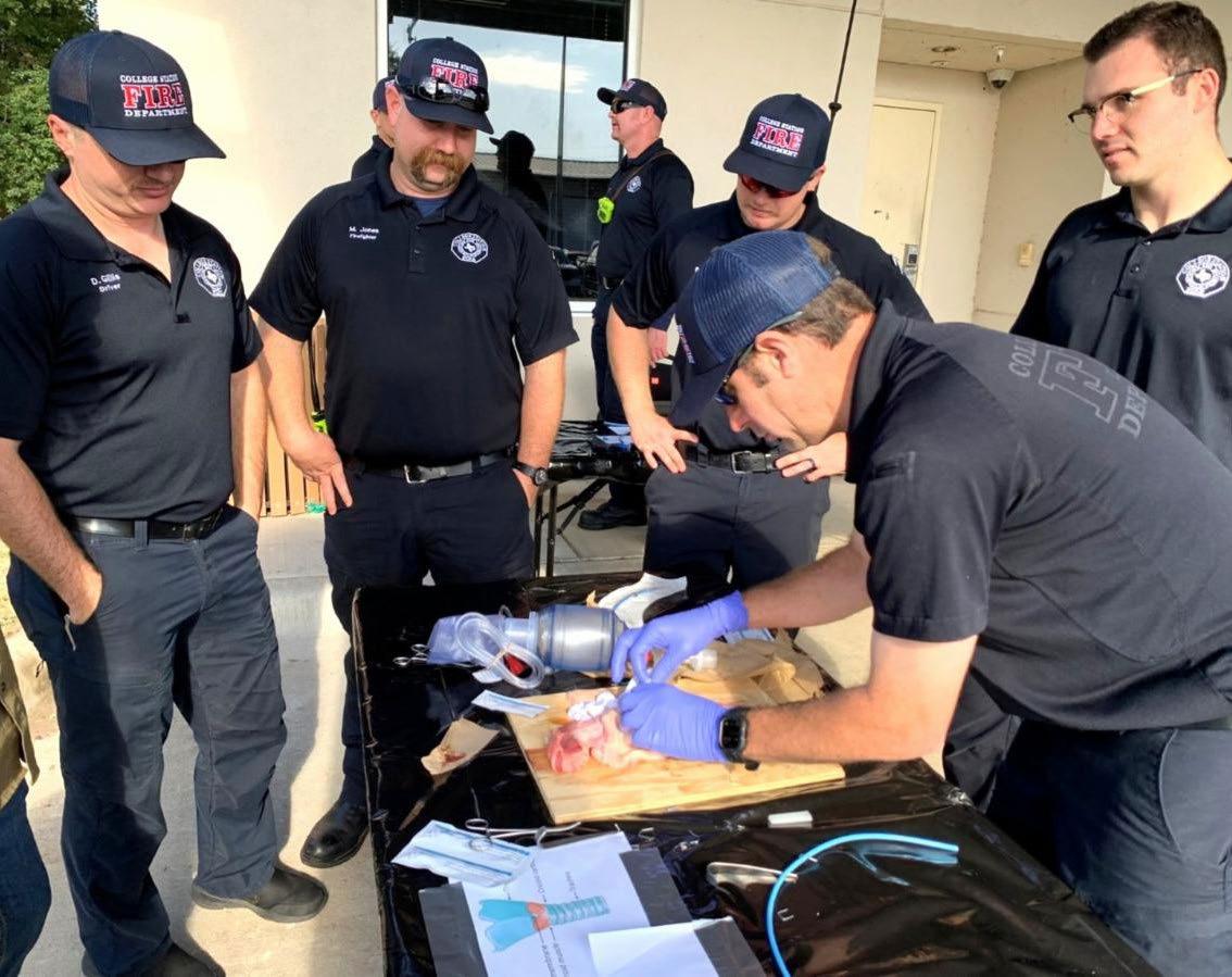 The department partnered with K&C Meat Processing in Navasota to provide swine trachea that are similar to human anatomy. Led by CSFD Medical Director Dr. Rob Schmidt and the department's field training officers, members received handson practice in the high-risk, low-frequency skill.