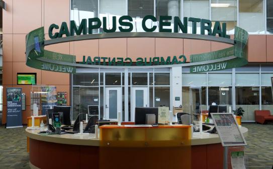 Campus Central and Brew 425 are located in the SSC and are considered the middle of campus because this is where most administrative offices are located. Campus Central is a circle desk with staff there to answer any questions. Across from Brew 425 is the Financial Aid office, which is also next to the Registration office, the Specialized Admissions office and the police walk-up desk. Counseling and Career Services are located above Campus Central on the third floor, and the Student Life Lounge and Student Life office are located below Campus Central on the ground floor.