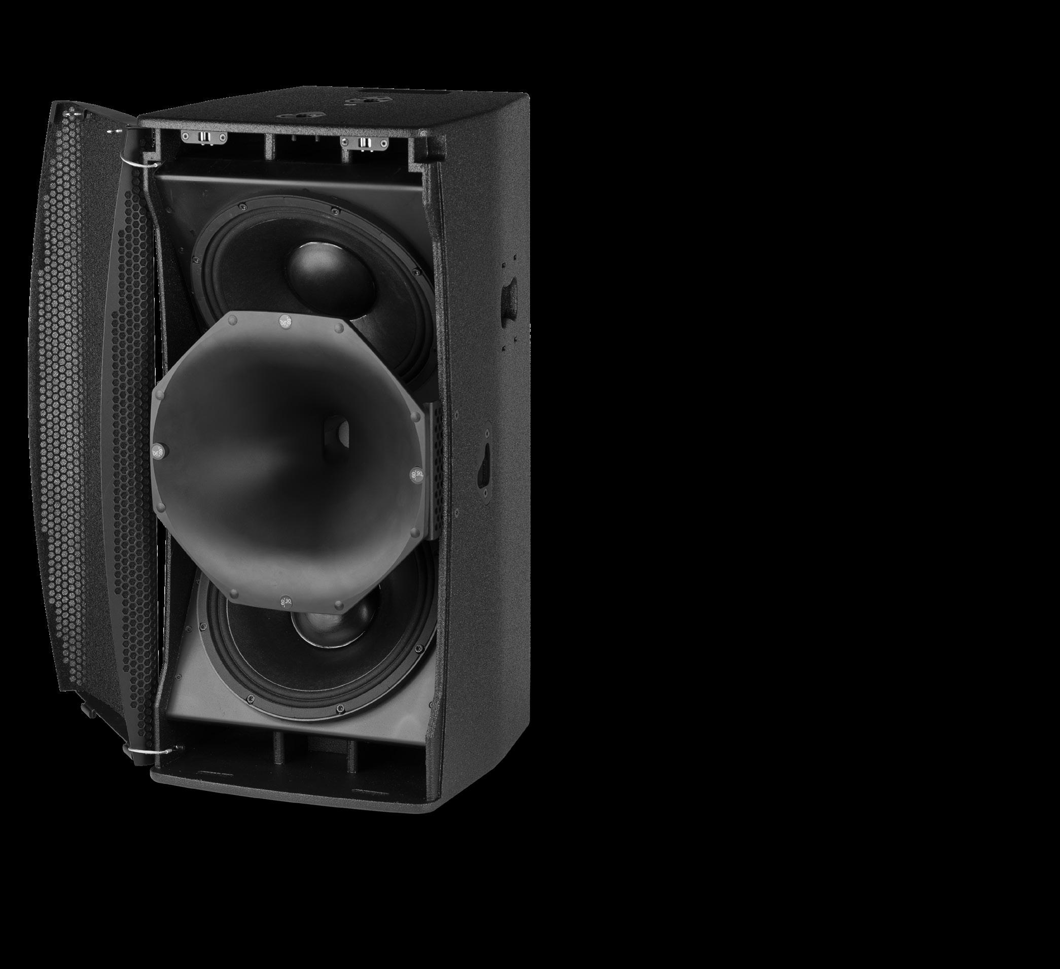 The high frequency driver contains an ultra-light 1.75” annular diaphragm which produces an exceptional transient response with very high efficiency from 1 kHz to 20 kHz. This new transducer was engineered to radiate a single source, coherent 100° wave front for superior dispersion control and crystal clear full spectrum sound. Together, they guarantee uniform coverage with perfect time alignment between the components.